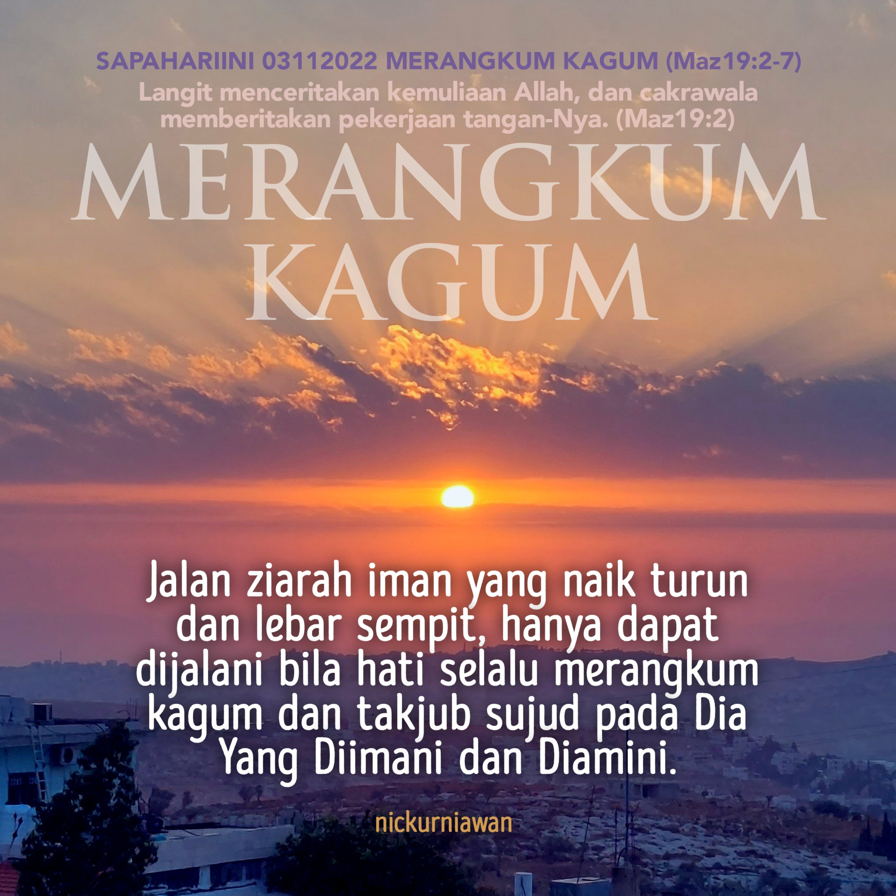 Sabda Tuhan hari ini mengajarkan bahwa jalan ziarah iman yang naik turun dan lebar sempit, hanya dapat dijalani bila hati selalu merangkum kagum dan takjub sujud pada Dia Yang Diimani dan Diamini, melampaui segala yang diciptakanNya.
