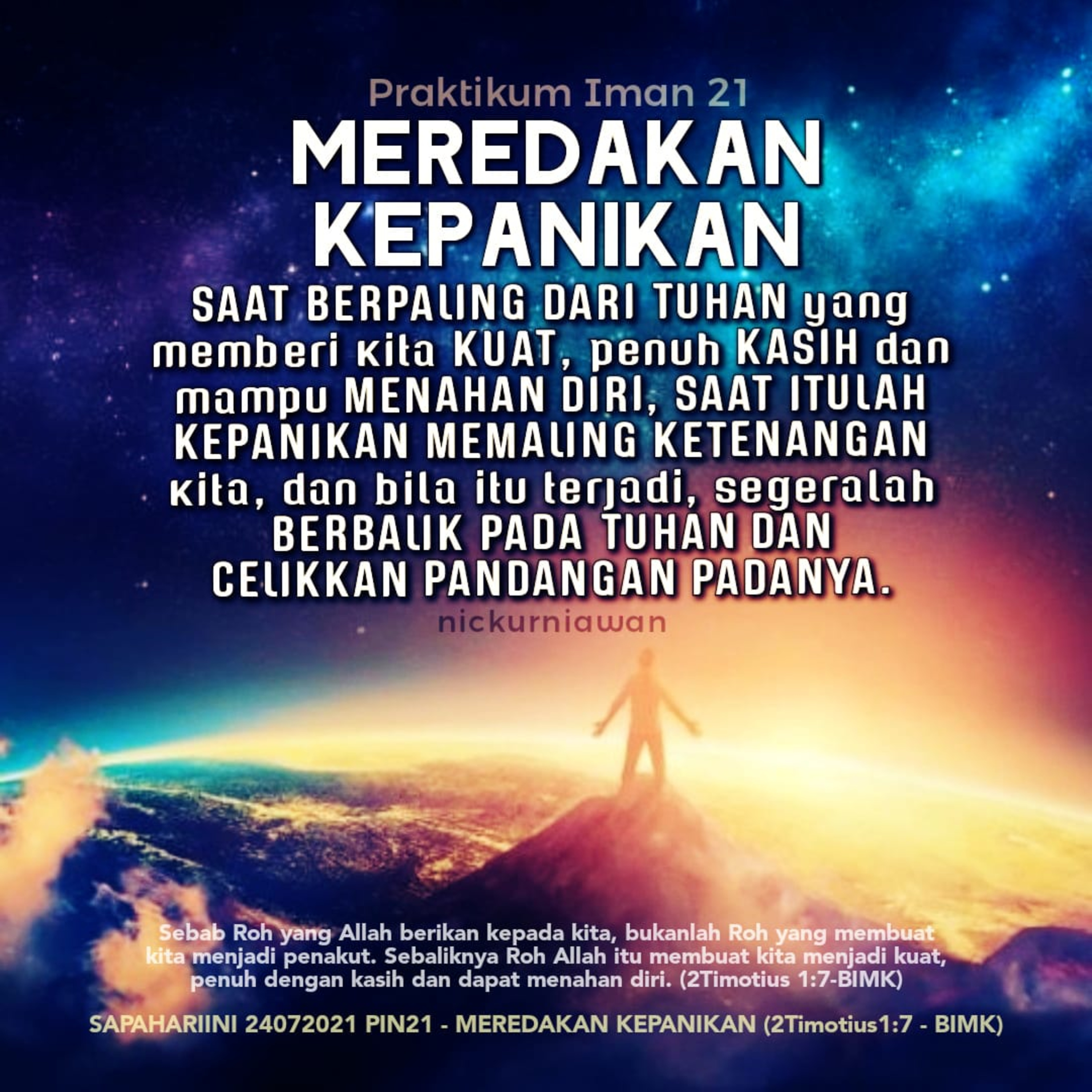 Sabda Tuhan dari nasihat Paulus kepada Timotius mengingatkan kita untuk MEREDAKAN KEPANIKAN, yaitu SAAT BERPALING DARI TUHAN yang membuat kita KUAT, penuh KASIH dan mampu MENAHAN DIRI, SAAT ITULAH KEPANIKAN MEMALING KETENANGAN kita, dan bila itu terjadi, segeralah BERBALIK PADA TUHAN DAN CELIKKAN PANDANGAN PADANYA.