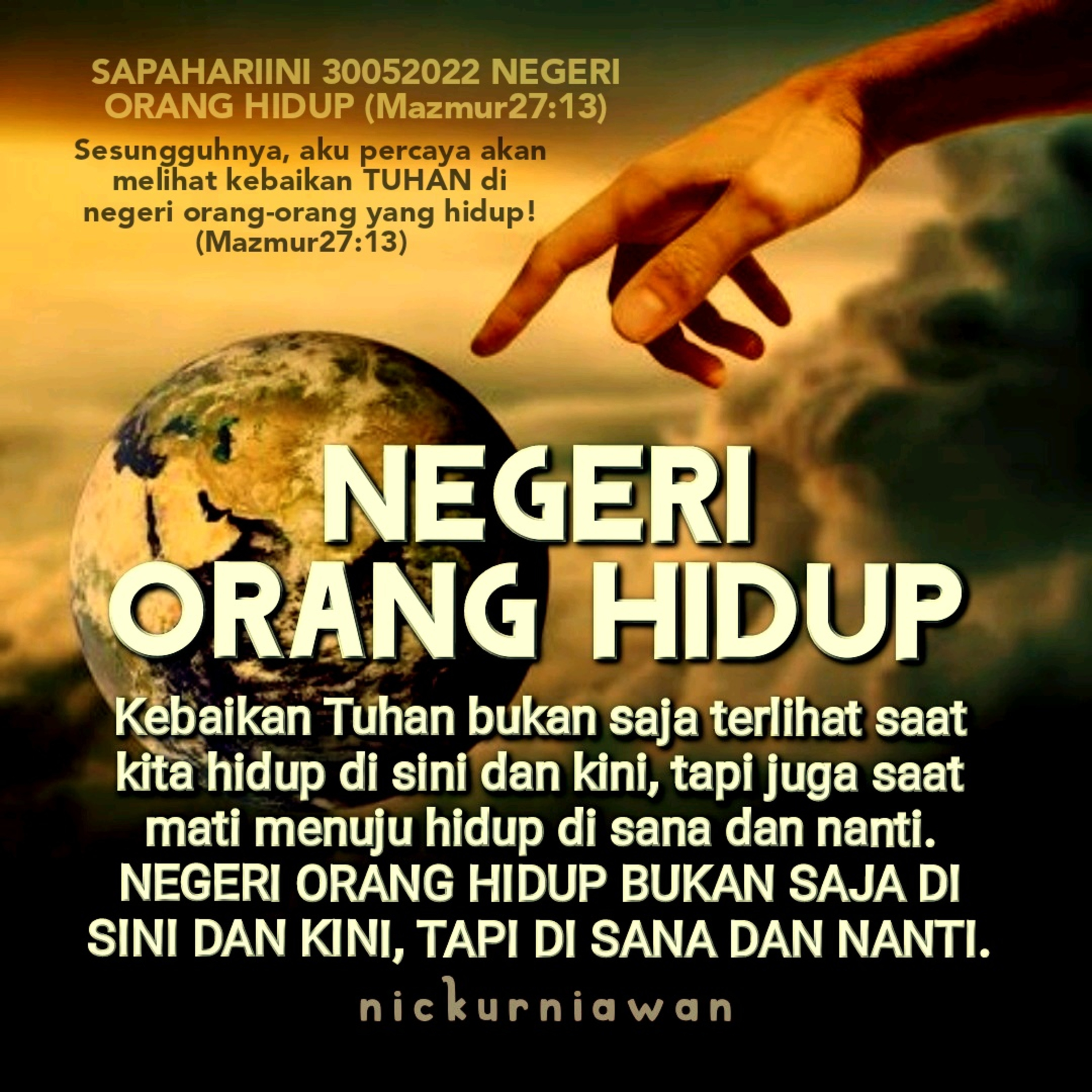 Sabda Tuhan meyakinkan kita yang memandang dengan mata iman bahwa kebaikanNya bukan saja terlihat saat kita hidup di sini dan kini, tapi juga saat mati menuju hidup di sana dan nanti. NEGERI ORANG HIDUP BUKAN SAJA DI SINI DAN KINI, TAPI DI SANA DAN NANTI.