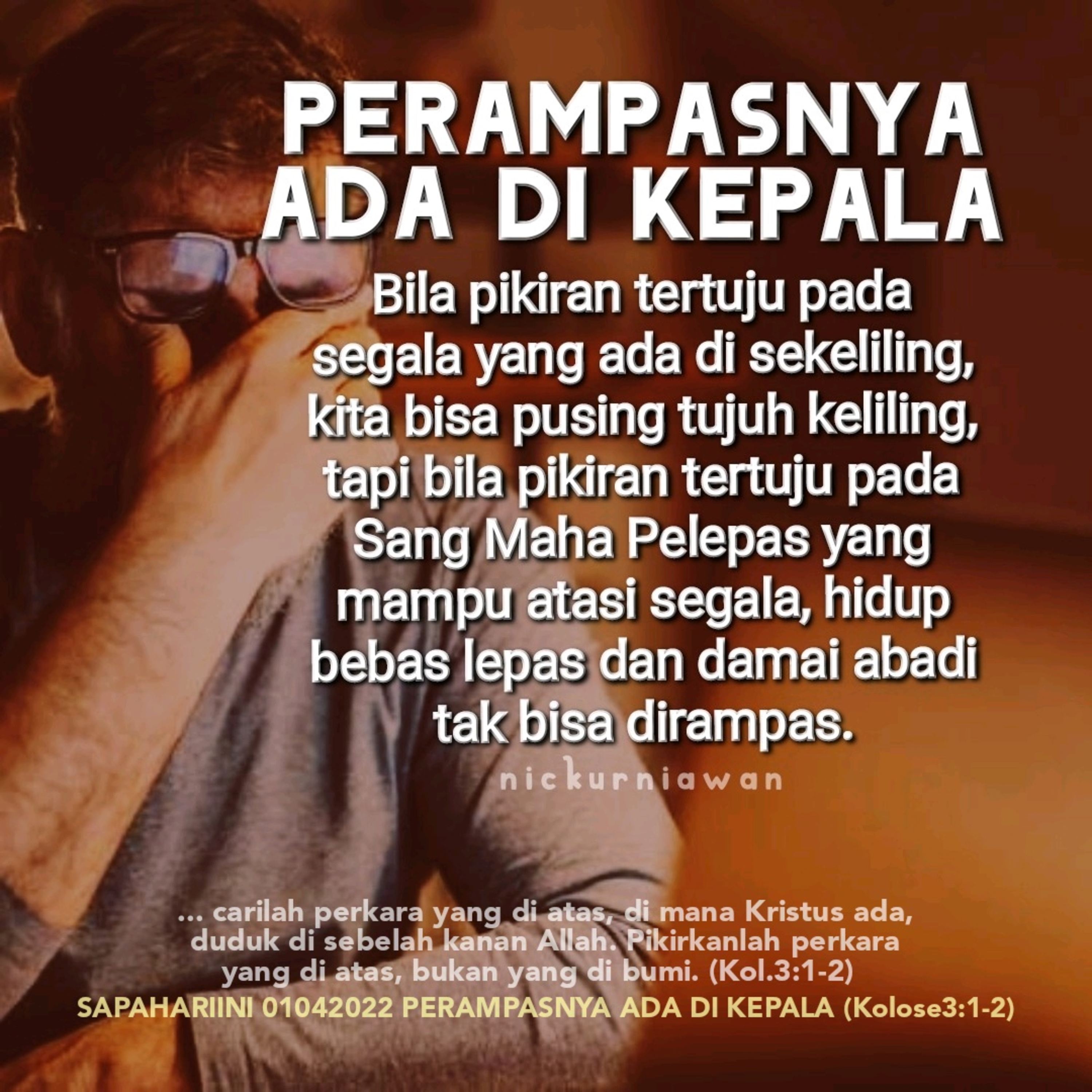 Sabda Tuhan mengajarkan kita untuk kendalikan pikiran kita, karena bila pikiran tertuju pada segala yang ada di sekeliling, kita bisa pusing tujuh keliling, tapi bila pikiran tertuju pada Sang Maha Pelepas yang mampu atasi segala, hidup bebas lepas dan damai abadi tak bisa dirampas.