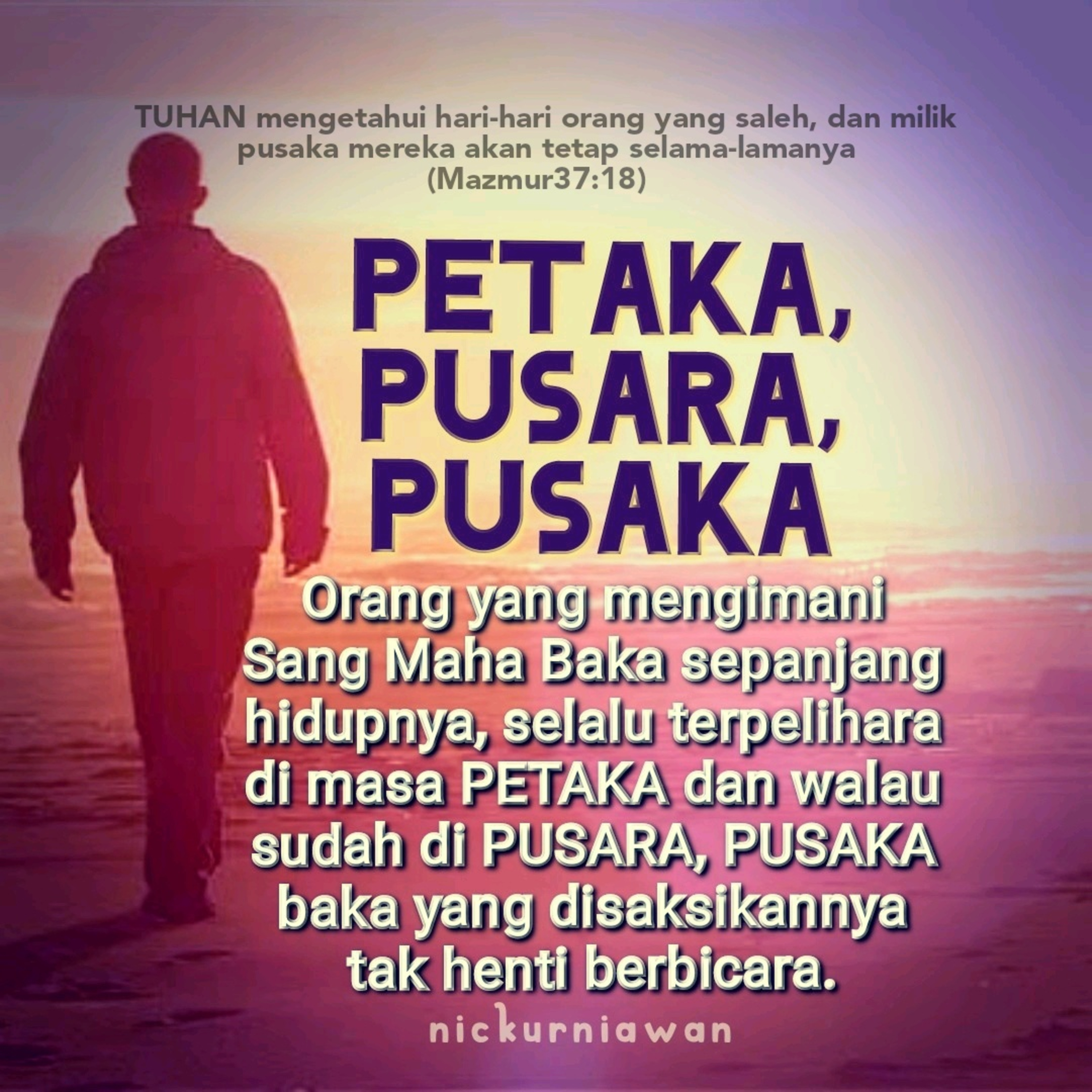 Sabda Tuhan mengingatkan bahwa orang yang mengimani Sang Maha Baka sepanjang hidupnya, selalu terpelihara di masa PETAKA dan walau sudah di PUSARA, PUSAKA baka yang disaksikannya tak henti berbicara.