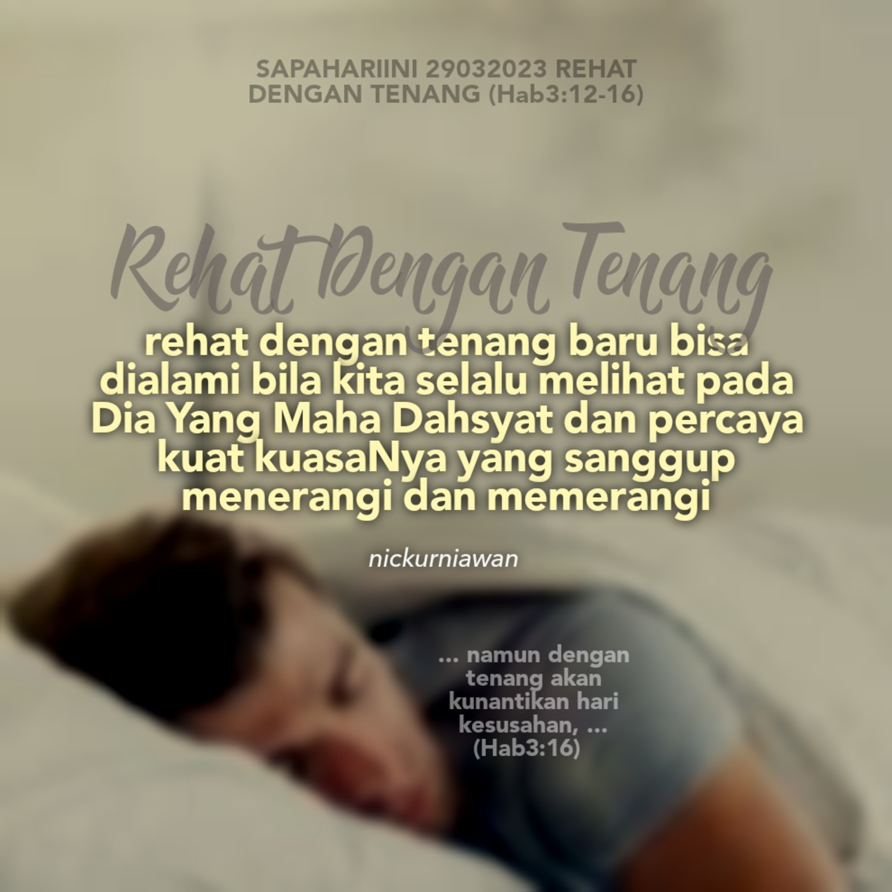 Sabda Tuhan dari sikap Habakuk yang bisa rehat dengan tenang waktu menghadapi kesusahan, karena selalu melihat pada Dia Yang Maha Dahsyat dan percaya kuat kuasaNya yang sanggup menerangi dan memerangi.