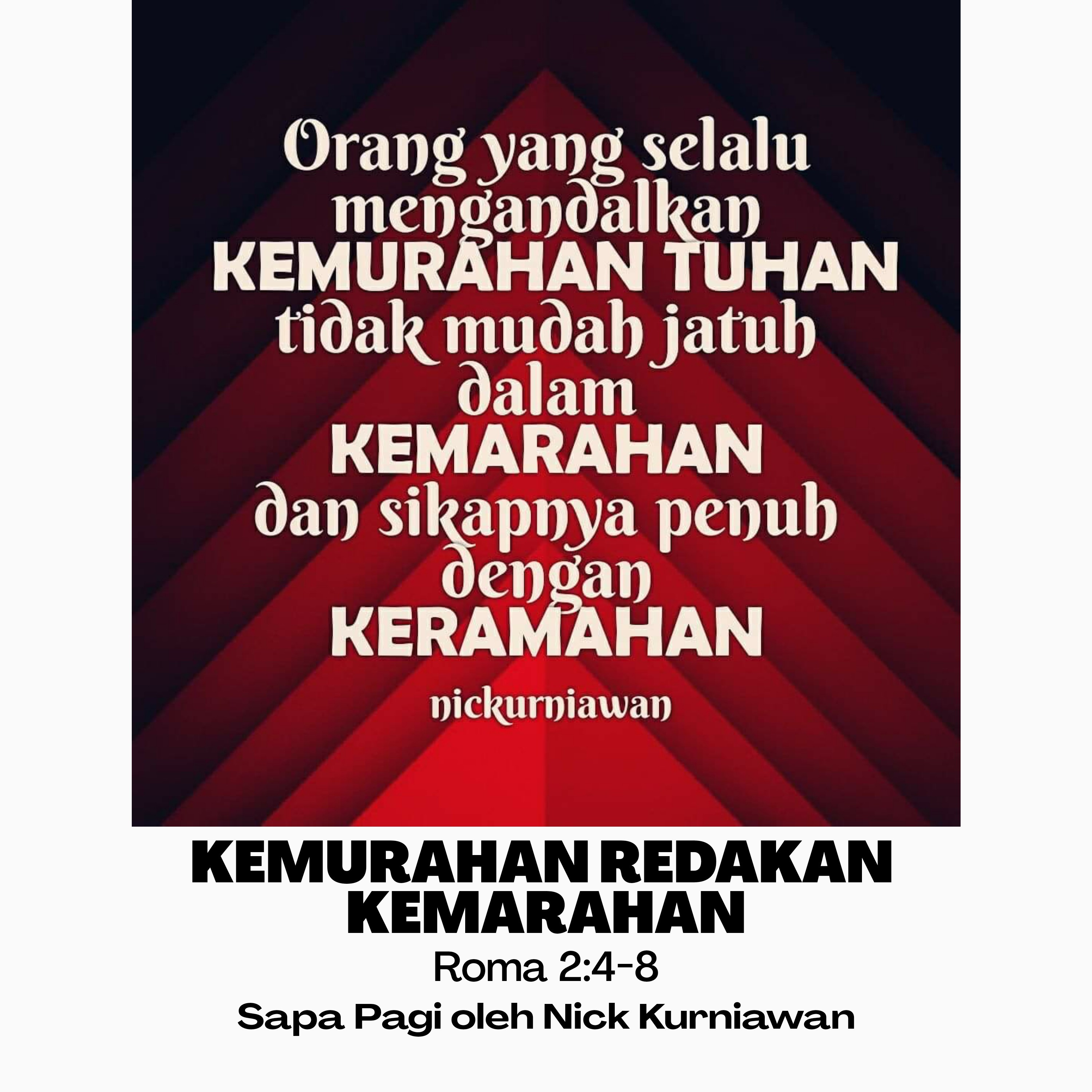 SabdaNya Menyapa kita untuk memahami bahwa kemurahan Tuhan yang dinyatakanNya begitu kaya untuk hanya dinikmati semata, tetapi sesungguhnya untuk menuntun pada pertobatan sehingga kemarahan Tuhan reda dan kita dipanggil untuk berlaku murah hati kepada sesama kita dengan meredakan kemarahan dan menunjukkan kemurahan dalam wujud keramahan.