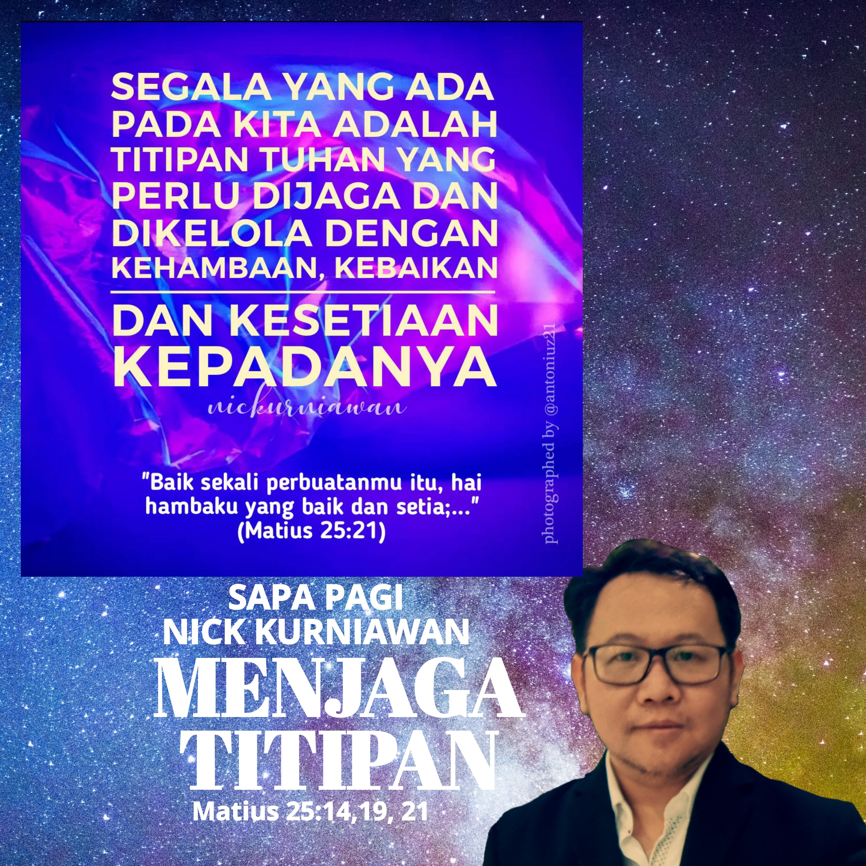 SabdaNya Menyapa Kita lagi untuk mengajarkan bahwa hidup dan segala apa yang ada pada kita adalah titipan Tuhan dan kita dipercayakan untuk menjaga dan mengelolanya dengan 3 faktor: (1) *kehambaan*: sadar bahwa kita dan segala yang ada pada kita adalah milik Tuhan, (2) *kebaikan*: tetap jadi baik dan berbuat baik walau kondisi tidak selalu baik, (3) *kesetiaan*: tetap tekun bergiat dalam waktu yang masih ada sebelum waktu menghadapNya tiba.