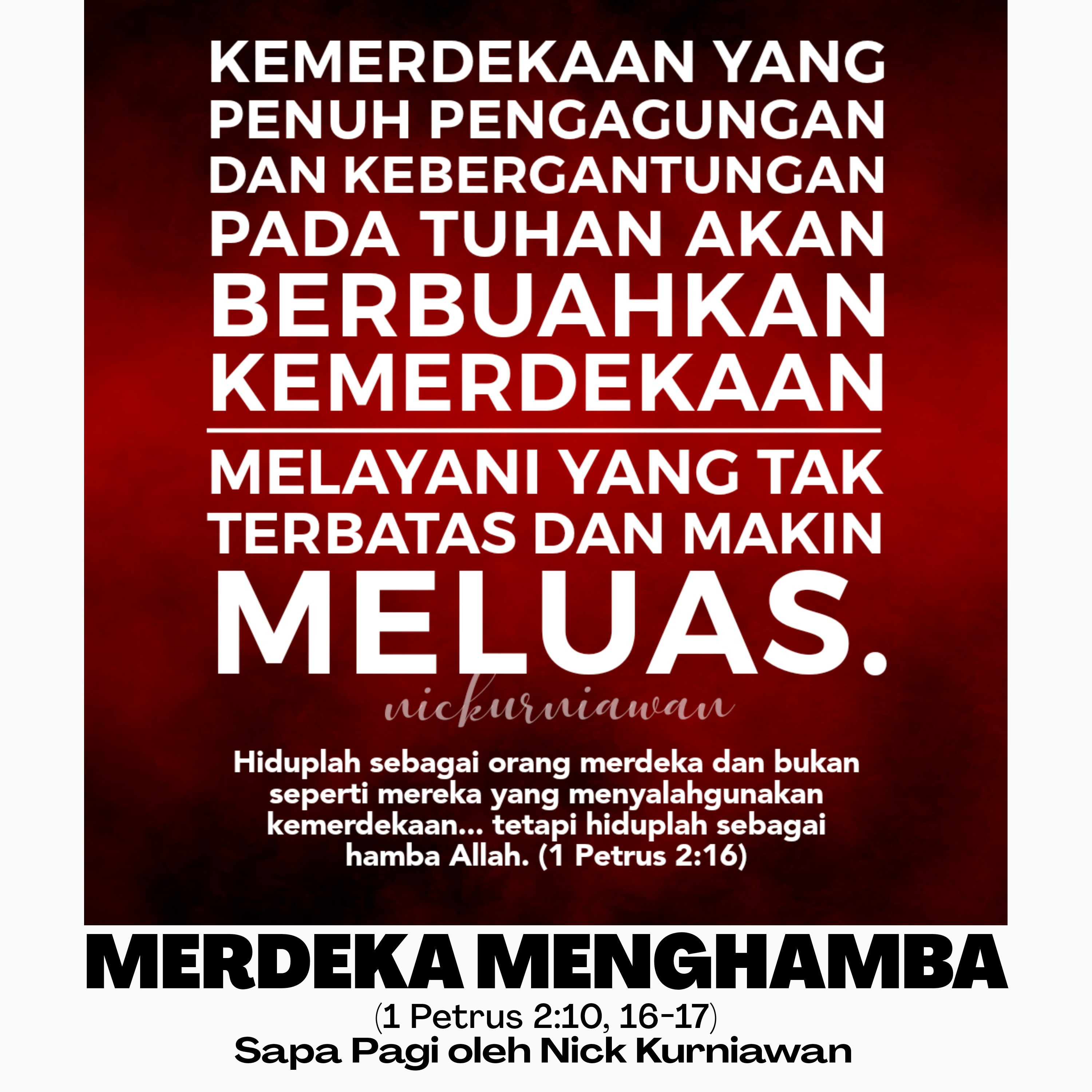 Sabda Nya Menyapa lagi hari ini ingin menyadarkan kita tentang status hamba yang dimerdekakan oleh kasih sayang Tuhan agar kita hidup merdeka dalam menghamba kepada Tuhan, yang berarti MERDEKA DALAM MENGAGUNGKAN TUHAN di sepanjang hidup kita setiap saat dan juga MERDEKA BERGANTUNG KEPADA TUHAN dalam segala hal karena Dia lah Sumber Kekuatan dan Kebergantungsn hidup kita, dengan demikian maka kita pun akan MERDEKA MELAYANI TUHAN tanpa batas dan makin meluas yaitu kepada semua orang dan segala bentuk lembaga-lembaga yang ada di dunia ini.