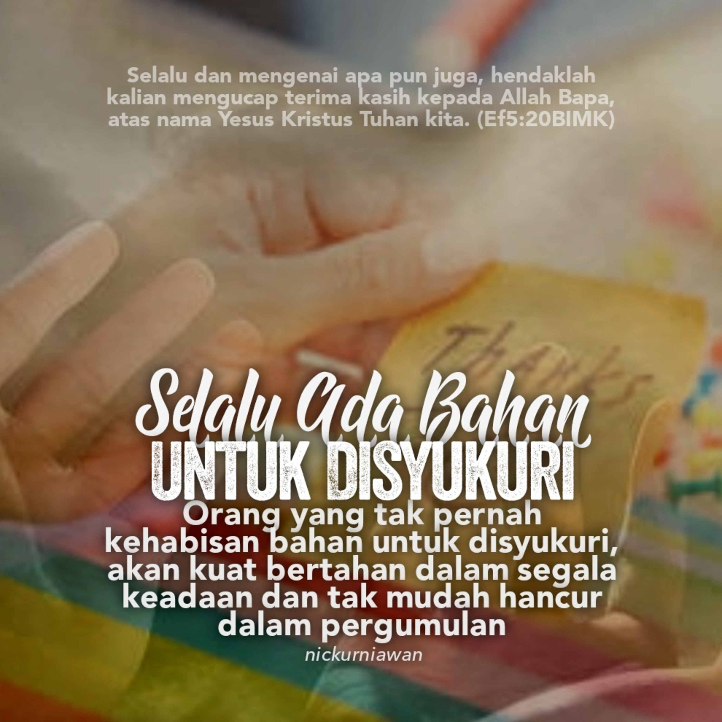 Sabda Tuhan mengajarkan bahwa orang yang percaya tak akan pernah kehabisan bahan untuk disyukuri, karena itu ia akan kuat bertahan dalam segala keadaan dan tak mudah hancur dalam pergumulan.