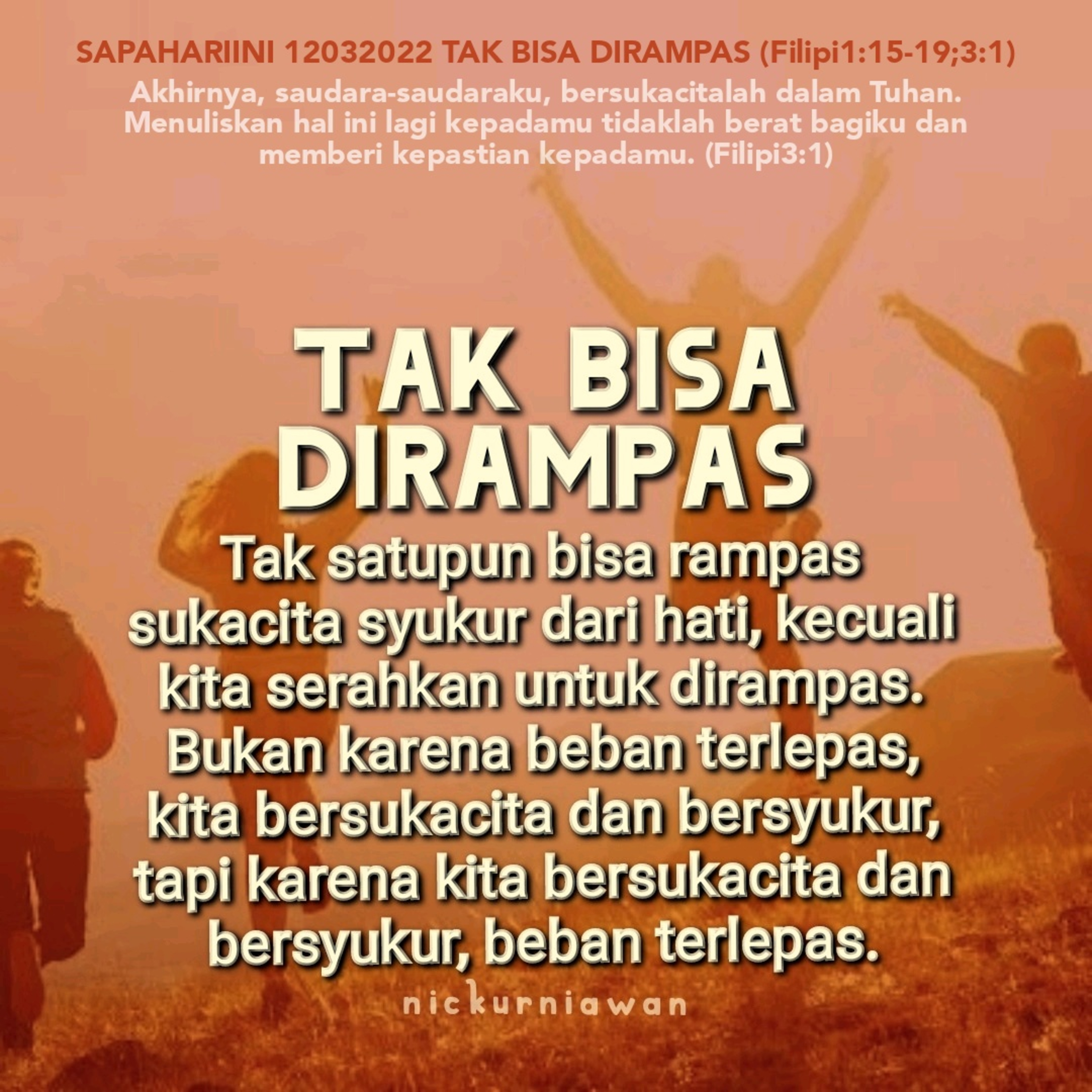 Sabda Tuhan tentang hidup berhikmat yang penuh sukacita dan syukur ingin mengingatkan bahwa tak satupun bisa rampas sukacita syukur dari hati, kecuali kita serahkan untuk dirampas. Bukan karena beban terlepas, kita bersukacita dan bersyukur, tapi karena kita bersukacita dan bersyukur, beban terlepas.