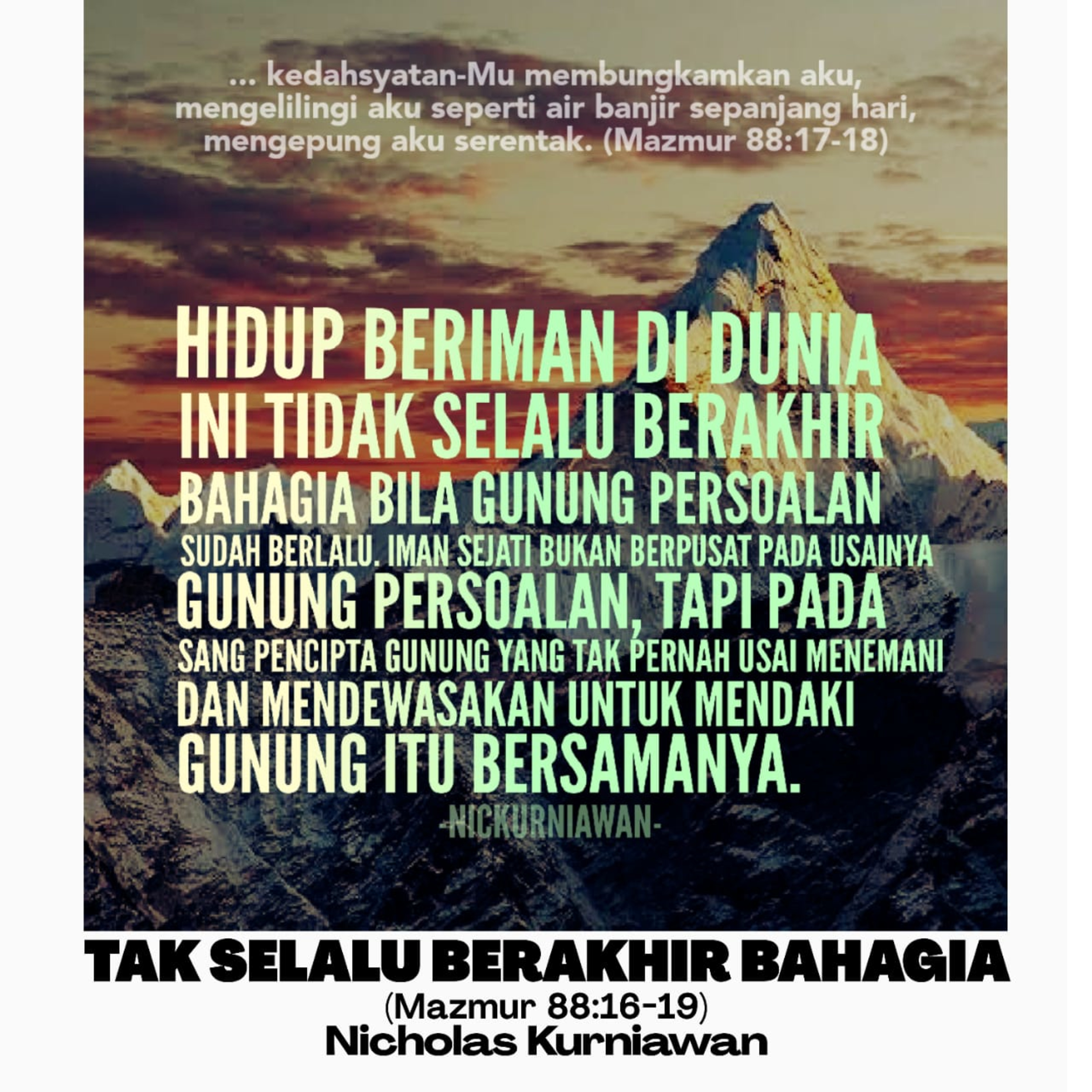 Sabda Tuhan menjelaskan dari pergumulan pemazmur dalam Mazmur 88:16-19, bahwa hidup orang beriman sejati tidak selalu berakhir bahagia karena gunung persoalan sudah berlalu, karena iman sejati yang mendalam bukan semata berpusat pada usainya gunung persoalan kita, tapi pada Tuhan Sang Pencipta segala gunung yang tak pernah usai menemani dan mendewasakan kita untuk mendaki gunung itu bersamaNya.