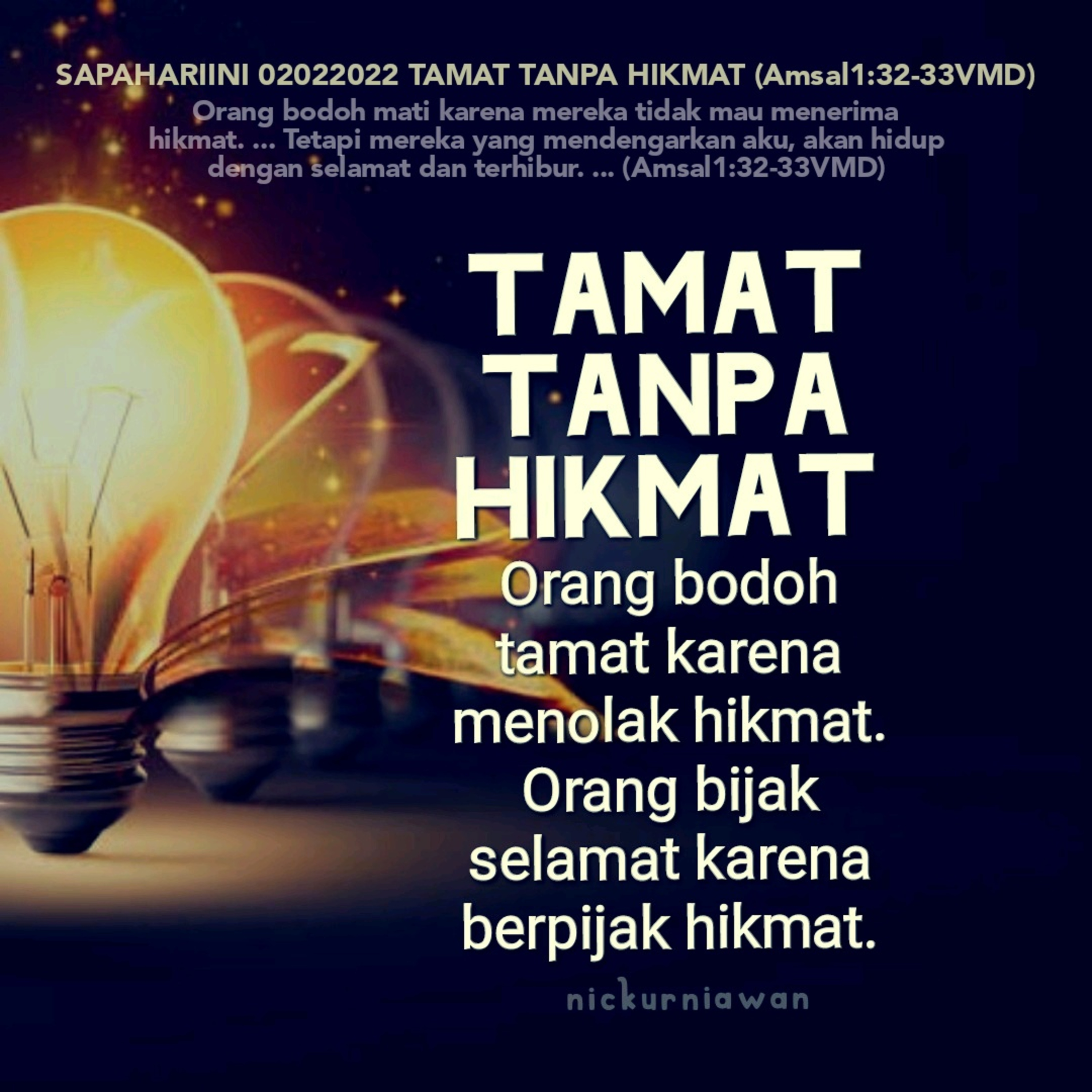 Sabda Tuhan tentang praktik hikmat setiap hari ingin mengingatkan untuk selalu hidup berhikmat, karena orang bodoh tamat karena menolak hikmat, tapi orang bijak selamat karena berpijak hikmat.