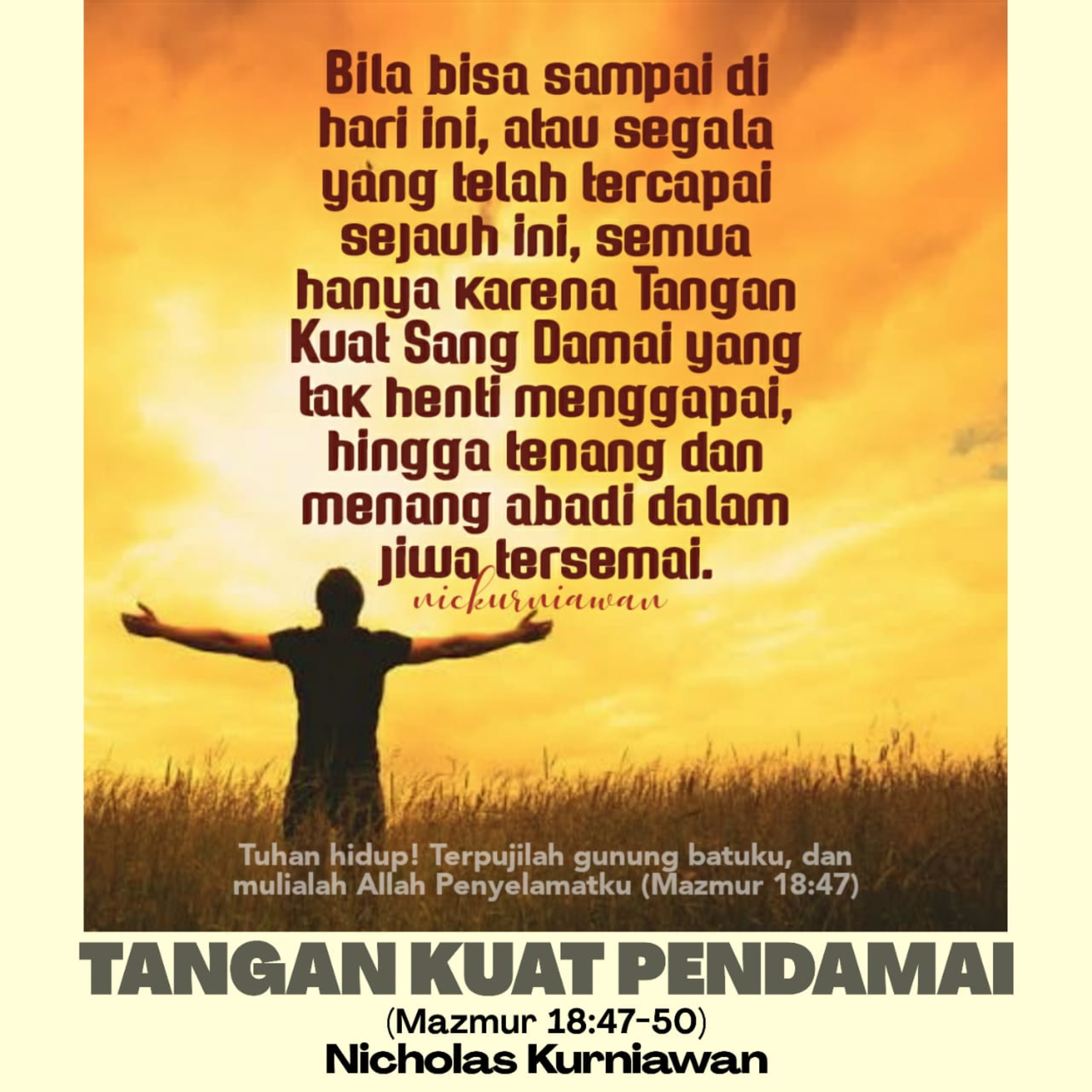 TANGAN KUAT PENDAMAI (Mazmur 18:47-50): Sabda Tuhan menyapa dari puncak Mazmur 18 berupa ungkapan kemuliaan dan peninggian nama Tuhan, karena Daud sadar bahwa bila bisa sampai ke hari kemenangannya dan segala yang telah dicapainya itu, semua hanya karena Tangan Kuat Sang Damai yang tak henti menggapai dan menyertai hidupnya, hingga tenang dan menang abadi dalam jiwanya tersemai.