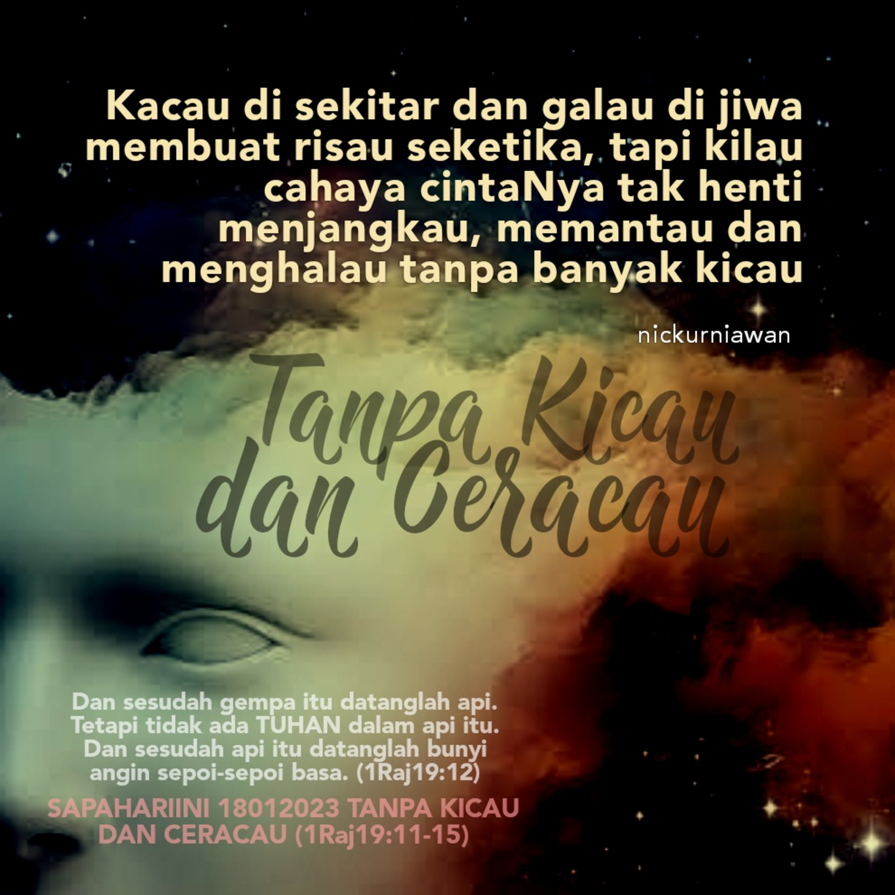 Sabda Tuhan dari cara Tuhan menenangkan Nabi Elia, mengajarkan bahwa kacau di sekitar dan galau di jiwa membuat risau seketika, tapi kilau cahaya cintaNya tak henti menjangkau, memantau dan menghalau tanpa kicau atau ceracau.