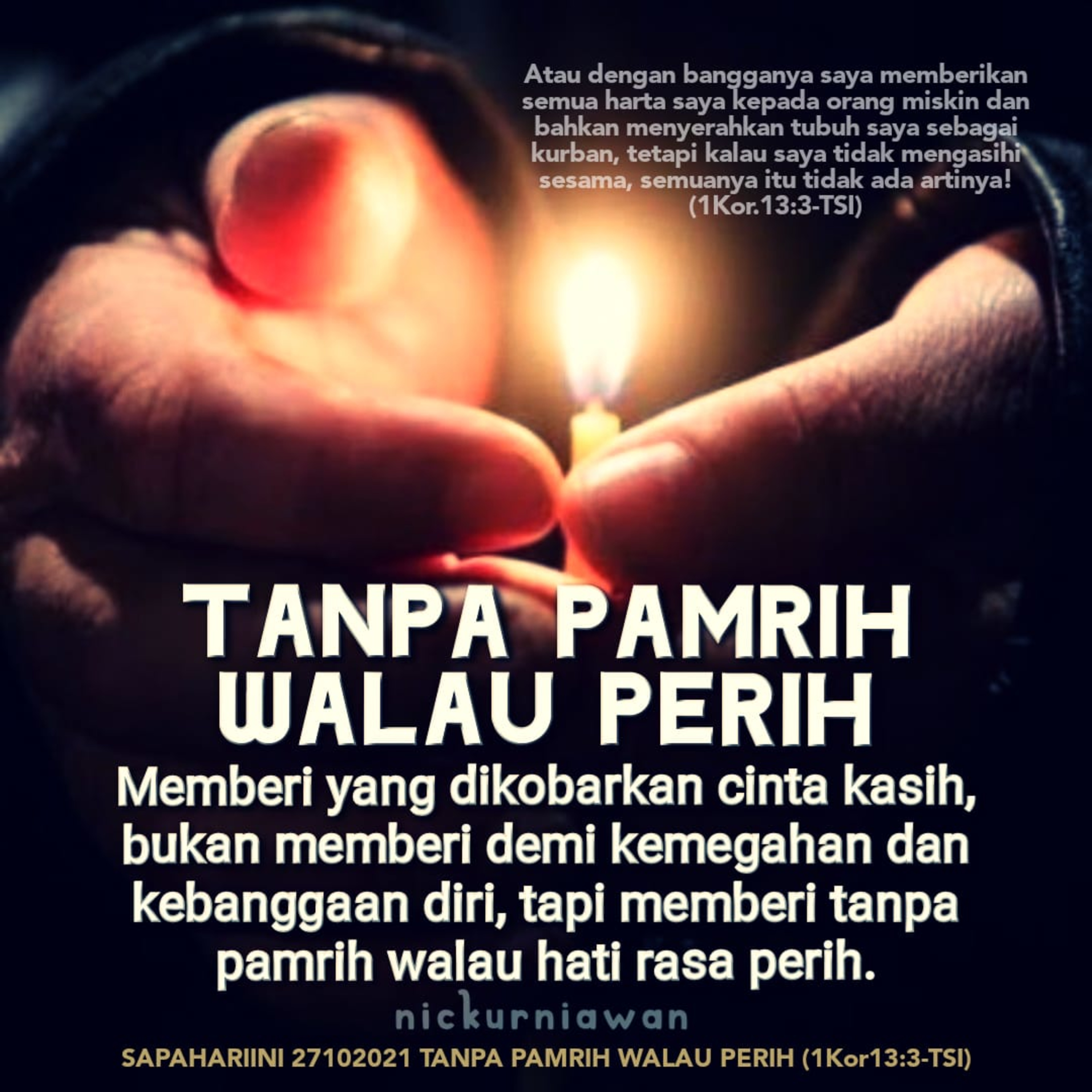 Sabda Tuhan dalam rangkaian renungan tentang cinta dari 1Korintus13 menjelaskan bahwa memberi yang dikobarkan api cinta kasih, bukan memberi demi kemegahan dan kebanggaan diri, tapi memberi tanpa pamrih walau hati rasa perih.