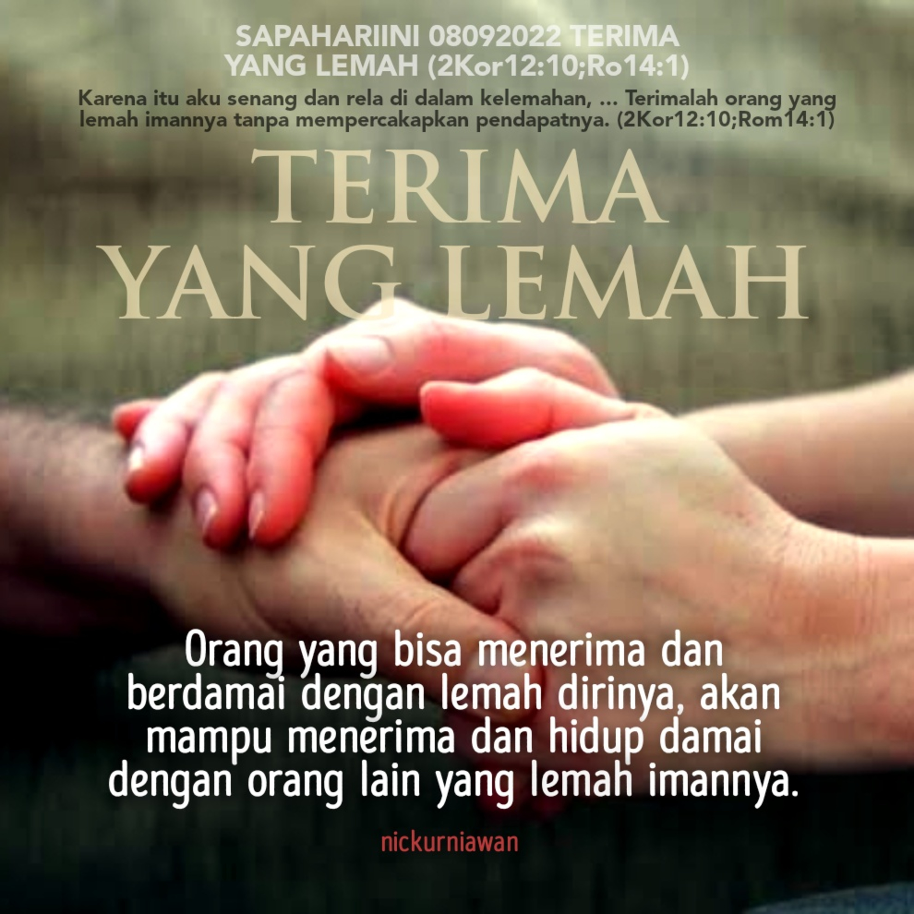 Sabda Tuhan mengingatkan kita untuk belajar menerima kelemahan bukan saja diri sendiri, tapi juga orang lain, karena orang yang bisa menerima dan berdamai dengan lemah dirinya, akan mampu menerima dan hidup damai dengan orang lain yang lemah imannya.