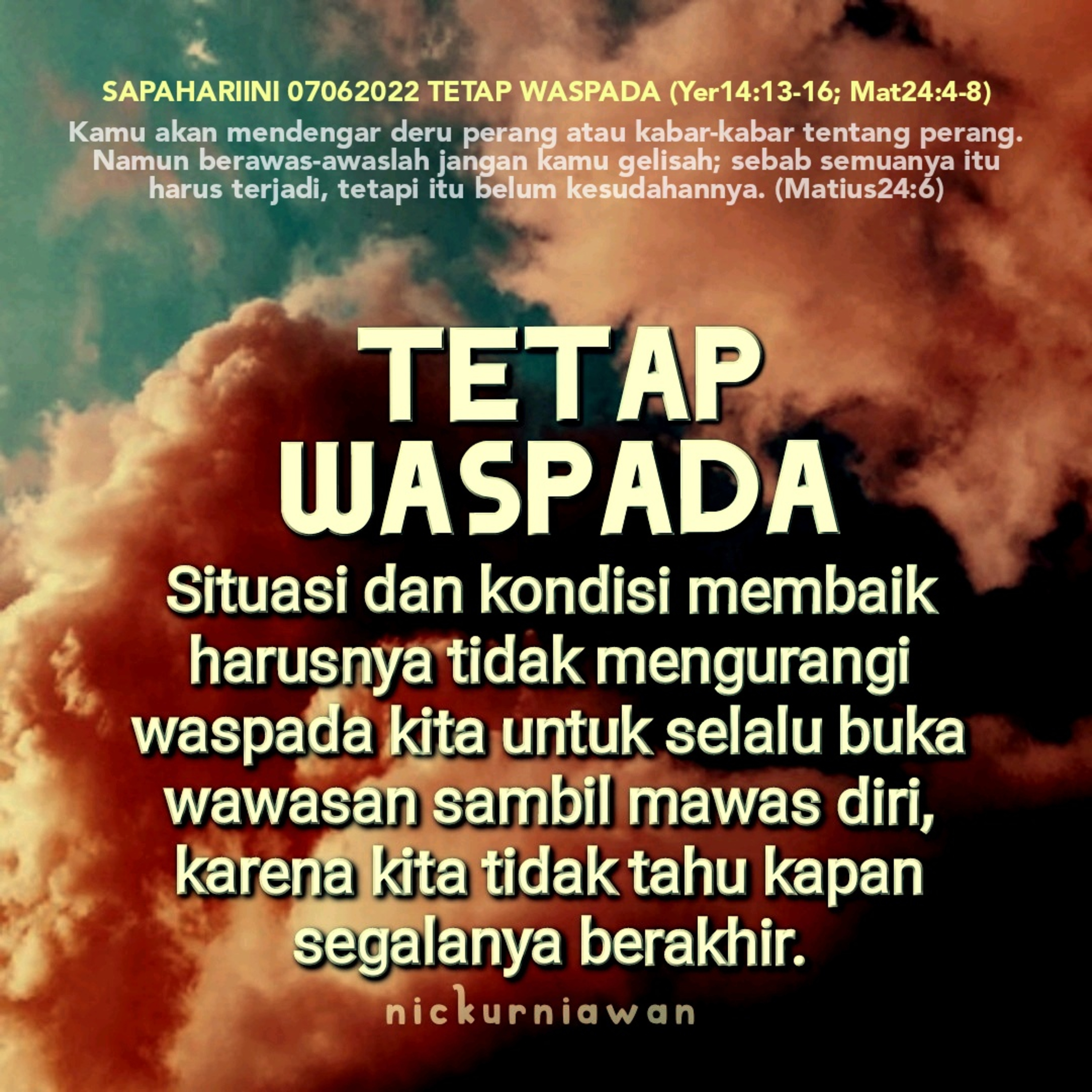 Sabda Tuhan mengajarkan bahwa situasi dan kondisi yang membaik harusnya tidak mengurangi waspada kita untuk selalu buka wawasan sambil mawas diri, karena kita tidak tahu kapan segalanya berakhir.