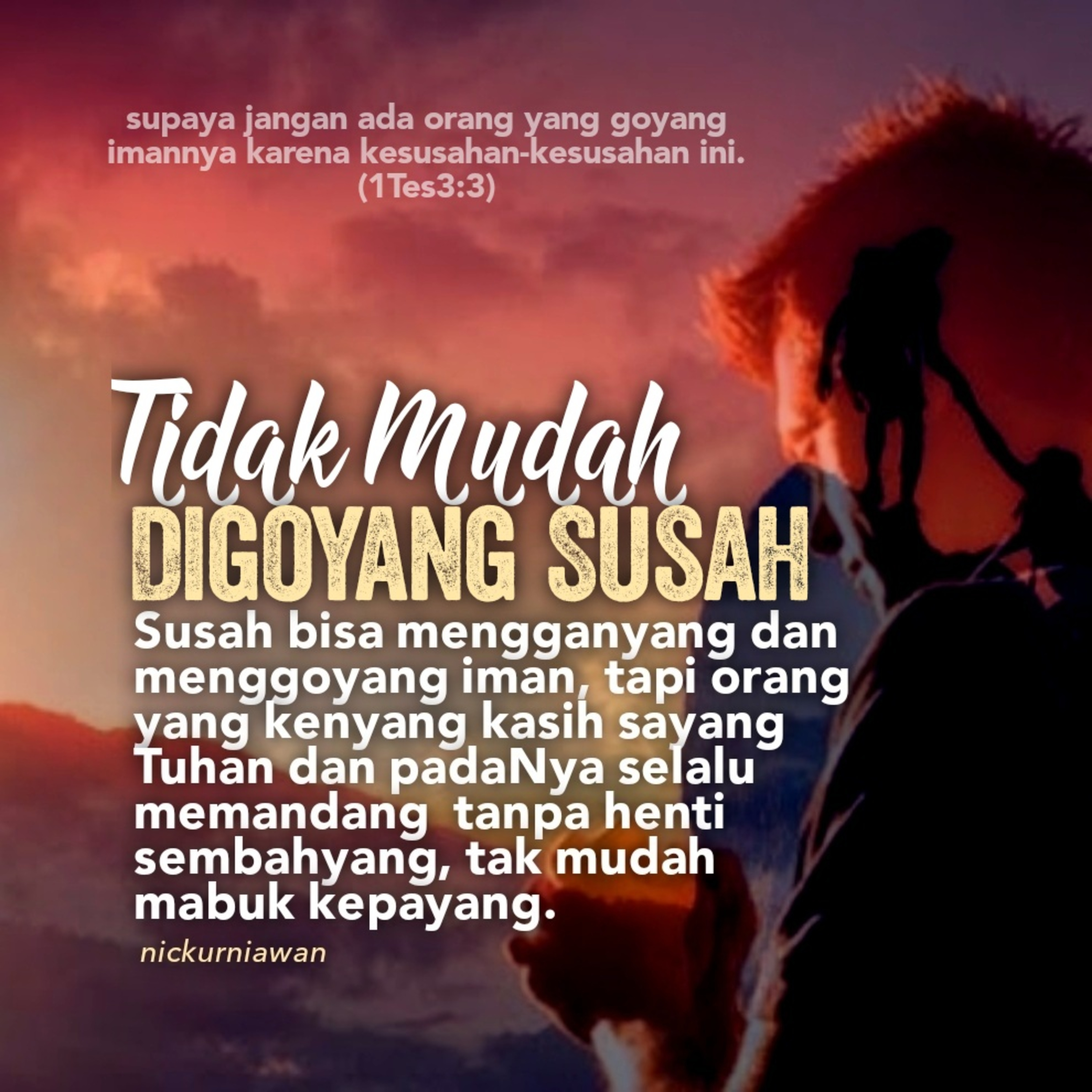 Sabda Tuhan ingatkan bahwa kesusahan bisa saja mengganyang dan menggoyang iman, tapi orang yang kenyang kasih sayang Tuhan dan padaNya selalu memandang tanpa henti sembahyang, tak mudah mabuk kepayang.