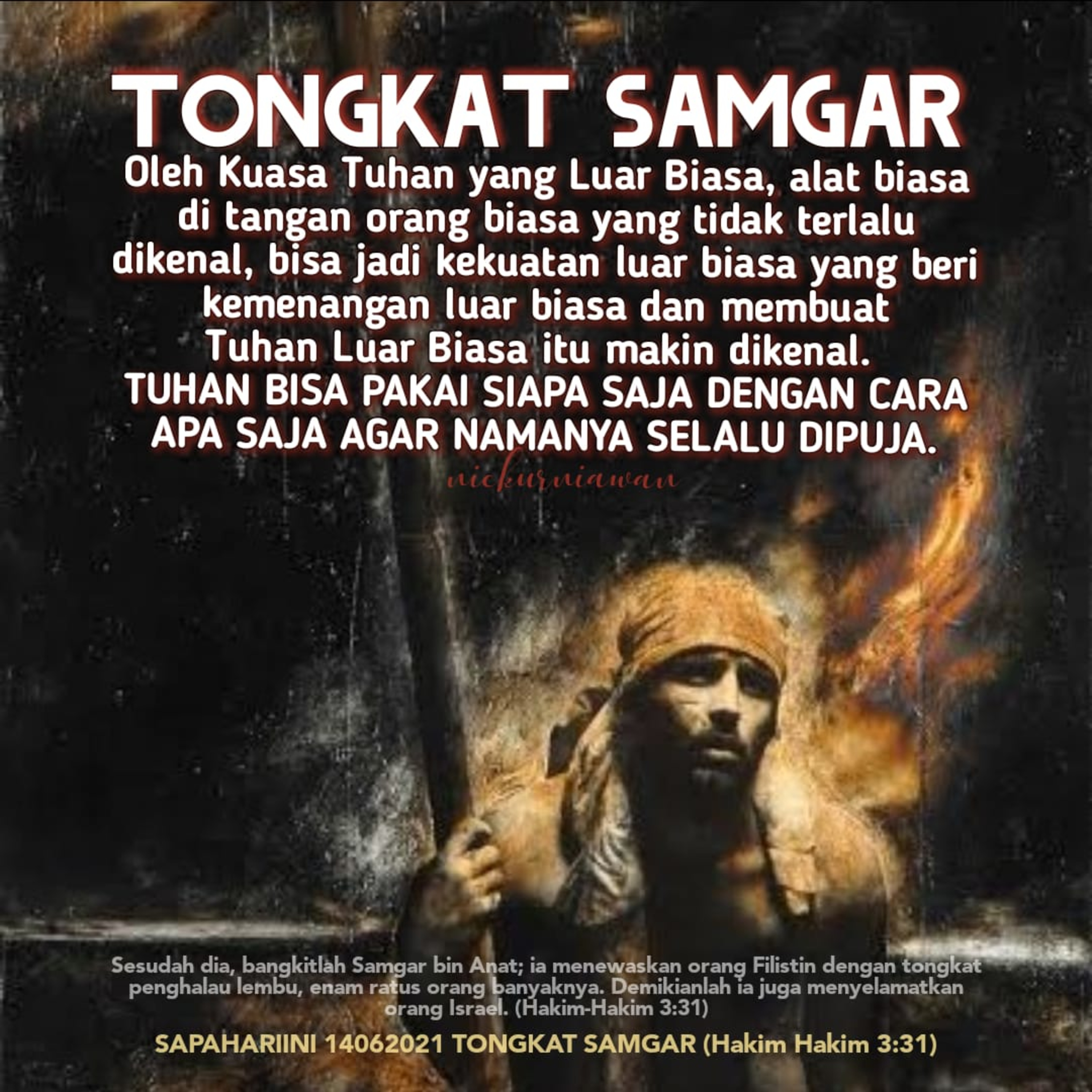 Sabda Tuhan dari tokoh Hakim Samgar menginspirasi kita bahwa oleh Kuasa Tuhan yang Luar Biasa, alat biasa di tangan orang biasa yang tidak terlalu dikenal, bisa jadi kekuatan luar biasa yang beri kemenangan luar biasa dan membuat Tuhan makin dikenal. TUHAN BISA PAKAI SIAPA SAJA DENGAN CARA APA SAJA AGAR NAMANYA SELALU DIPUJA.
