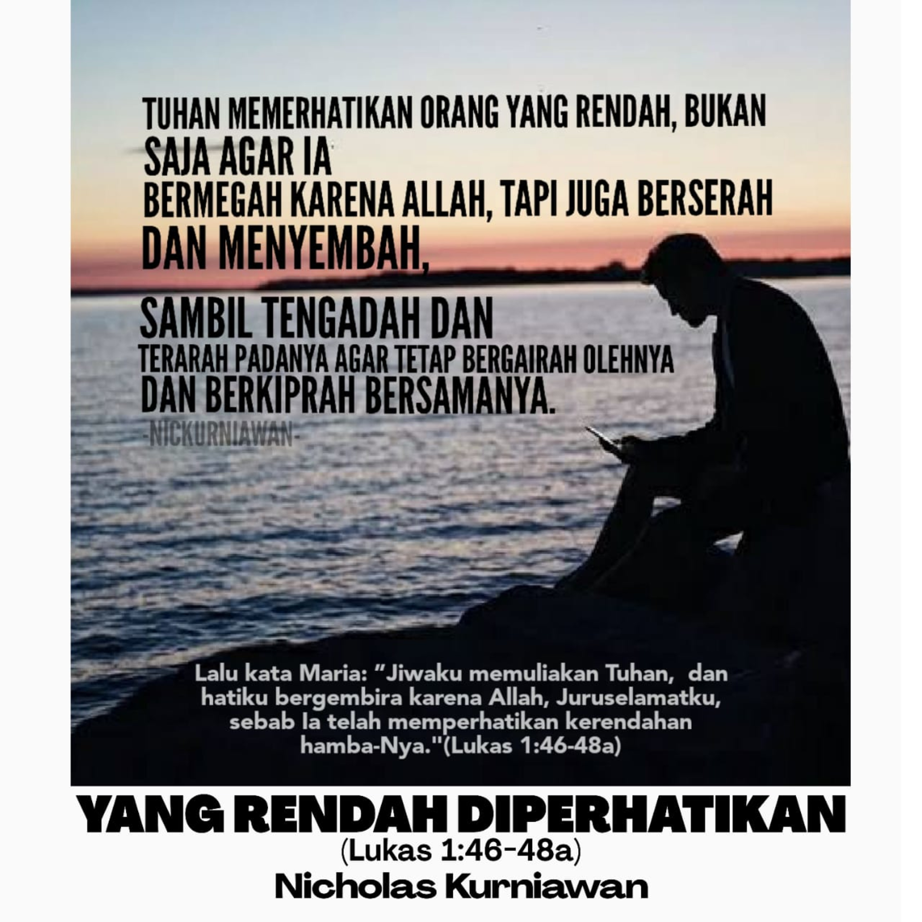 YANG RENDAH DIPERHATIKAN (Lukas 1:46-48a): Sabda Tuhan mengajarkan lewat nyanyian Maria bahwa Allah memerhatikan orang yang rendah, bukan saja agar orang itu bermegah karena Allah, tapi juga berserah dan menyembah, sambil tengadah dan terarah padaNya agar tetap bergairah olehNya dan berkiprah bersamaNya.