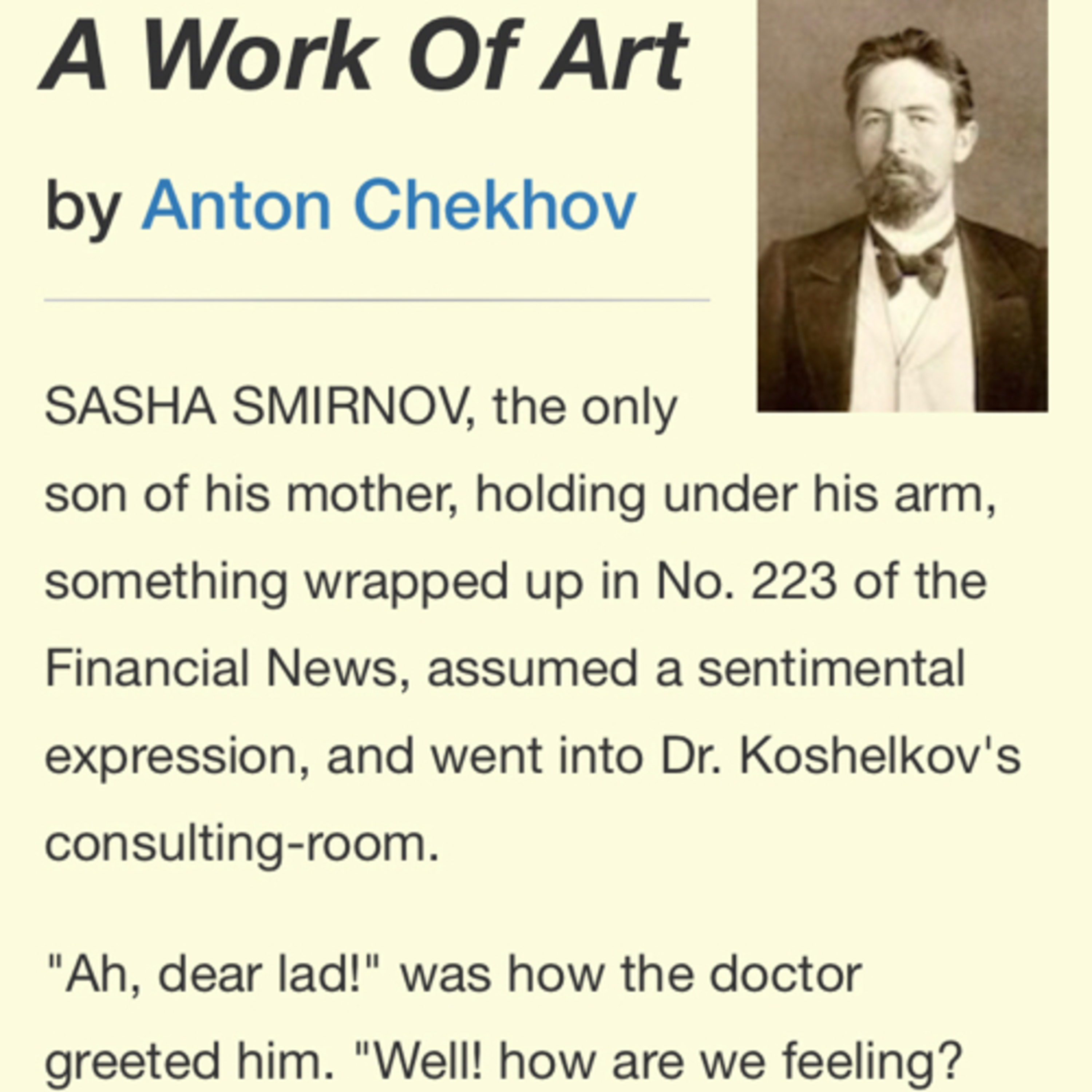 By Anton Tchekhov. https://americanliterature.com/author/anton-chekhov/short-story/a-work-of-art