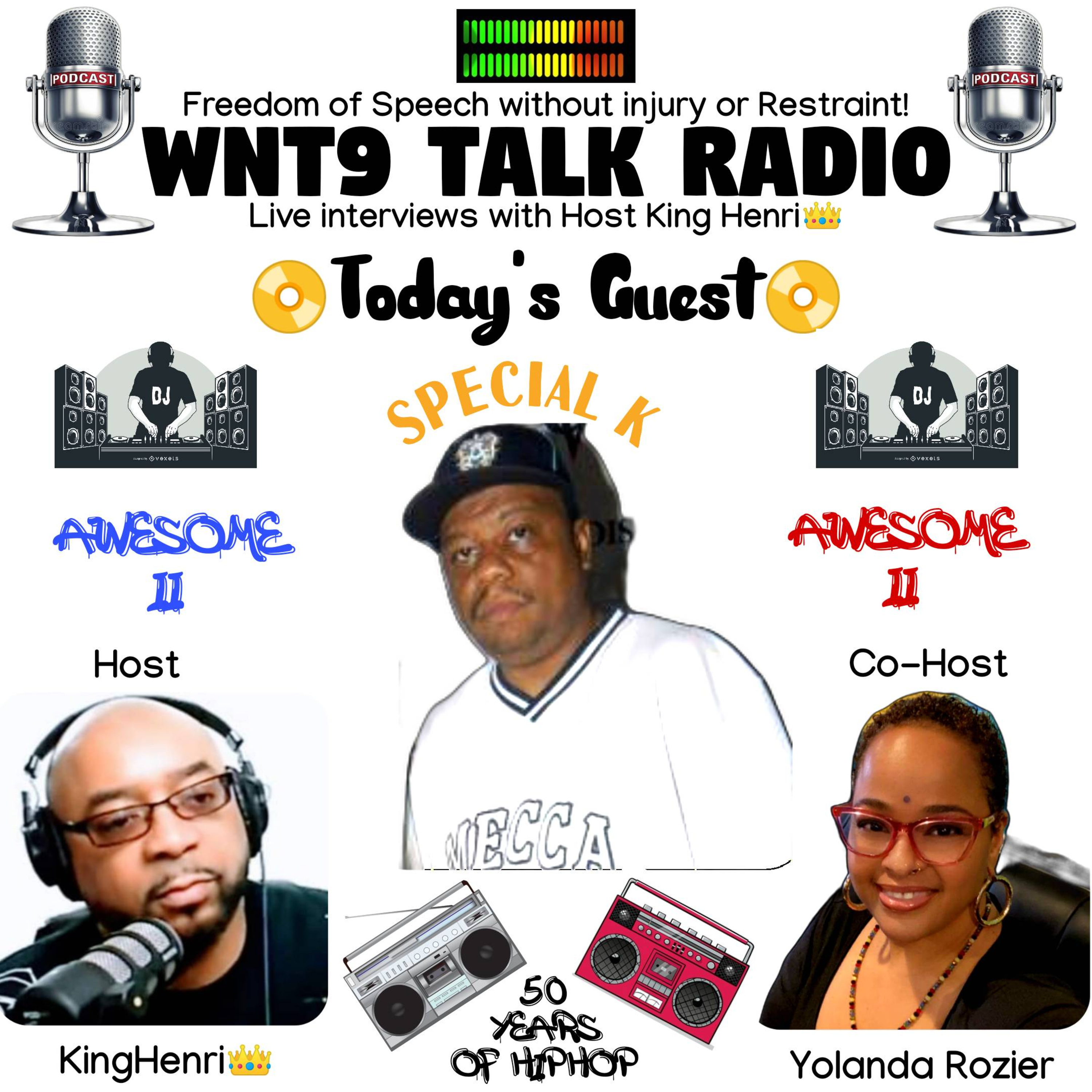 Todays episode we interview Special K of The Awesome II. Special K is a Radio Personality, DJ, Manager, writer amongst other things. from Passaic NJ onto traveling the world doing what he loves. Tune in now and get a sense of some of the things that happens behind the scene of a young man with a music dream come true. WNT9 TALK RADIO with King Henri and Yolanda Rozier.