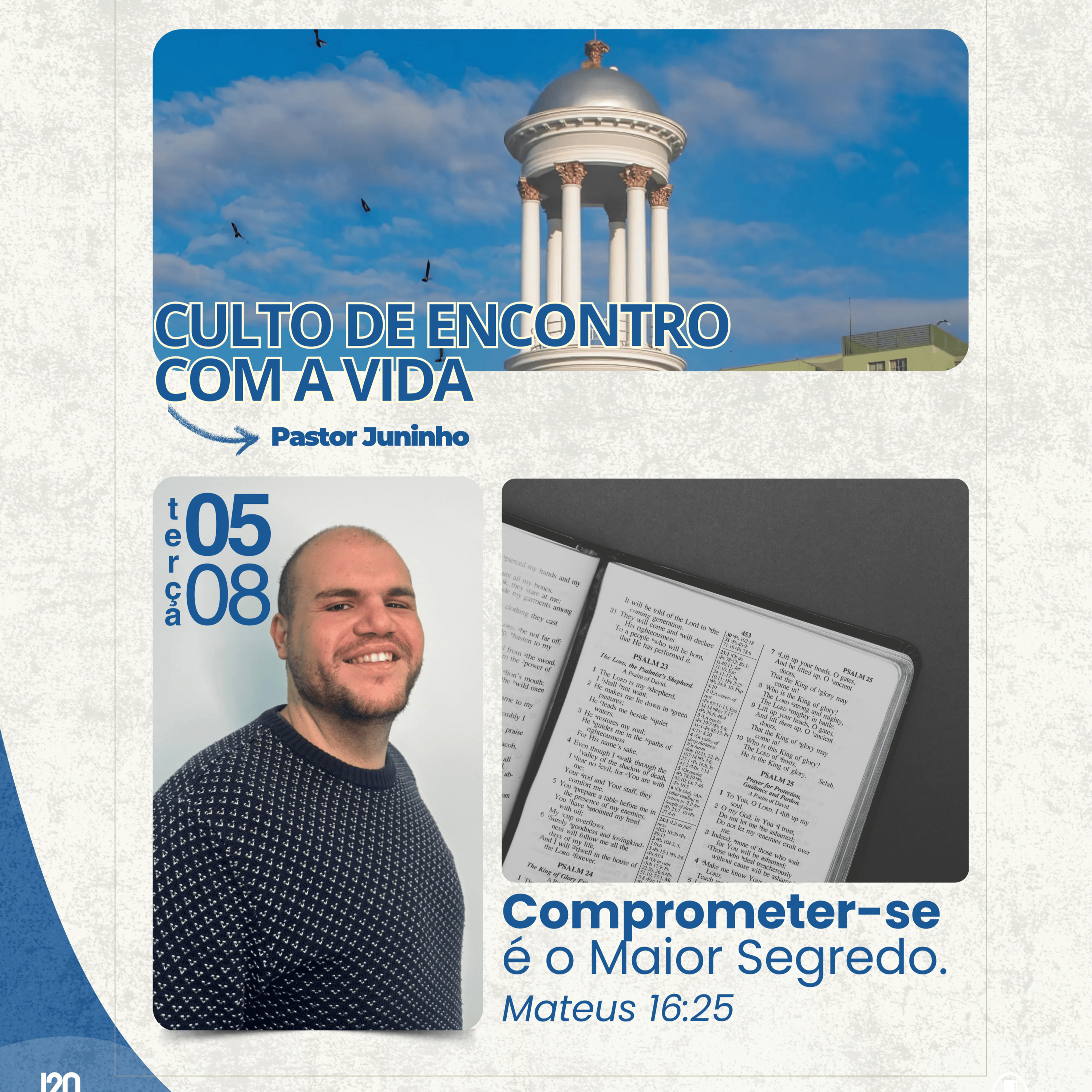 No dia 5 de agosto de 2025, o Pastor Juninho ministrou a Palavra no Culto de Encontro com a Vida com o tema: “Comprometer-se é o Maior Segredo”