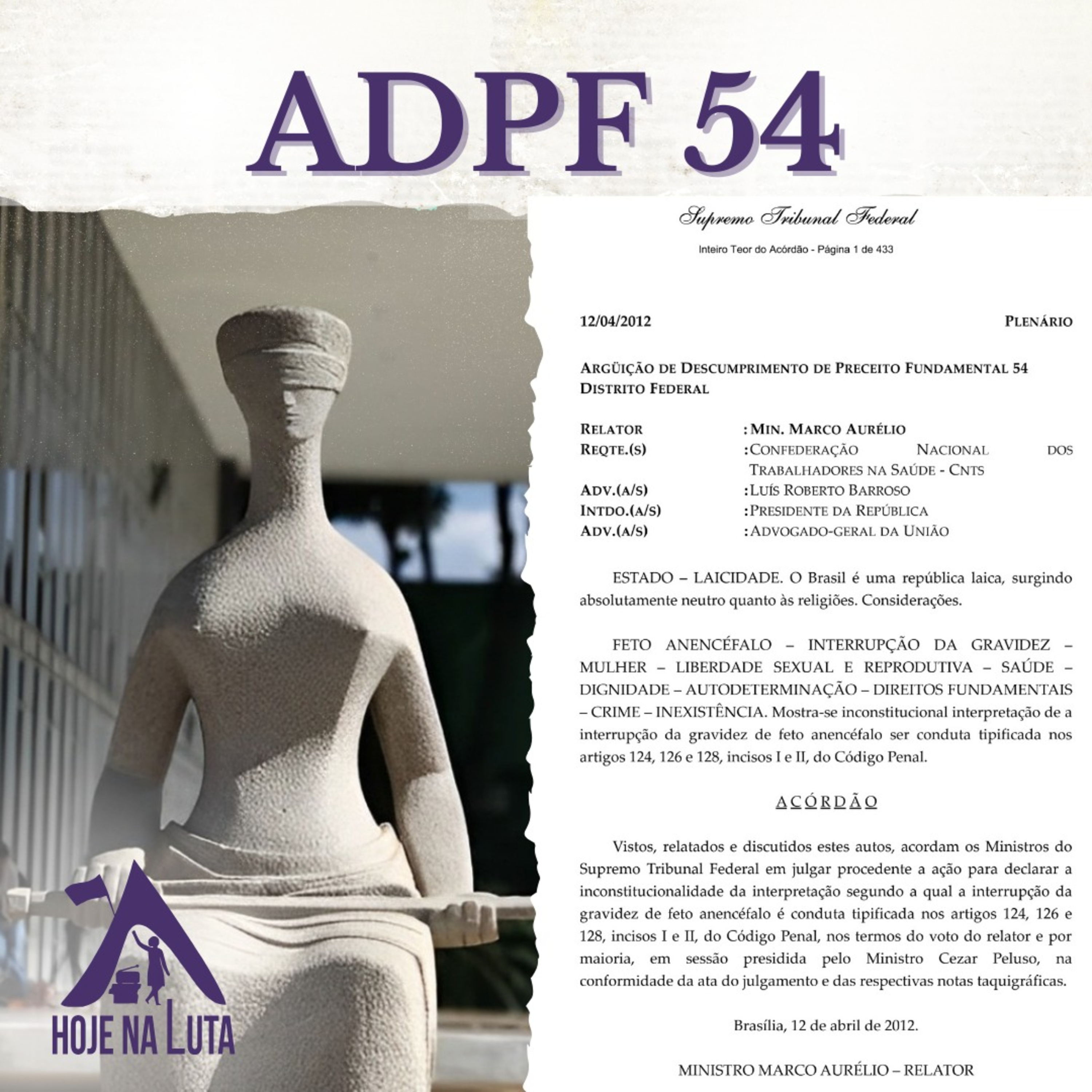 Em 2012, o Supremo Tribunal Federal (STF) do Brasil tomou uma decisão histórica ao reconhecer que o aborto de fetos anencéfalos não é crime, atendendo à Arguição de Descumprimento de Preceito Fundamental (ADPF) nº 54 ajuizada pela Confederação Nacional dos Trabalhadores na Saúde (CNTS). A anencefalia é uma condição congênita grave e incompatível com a vida após o nascimento