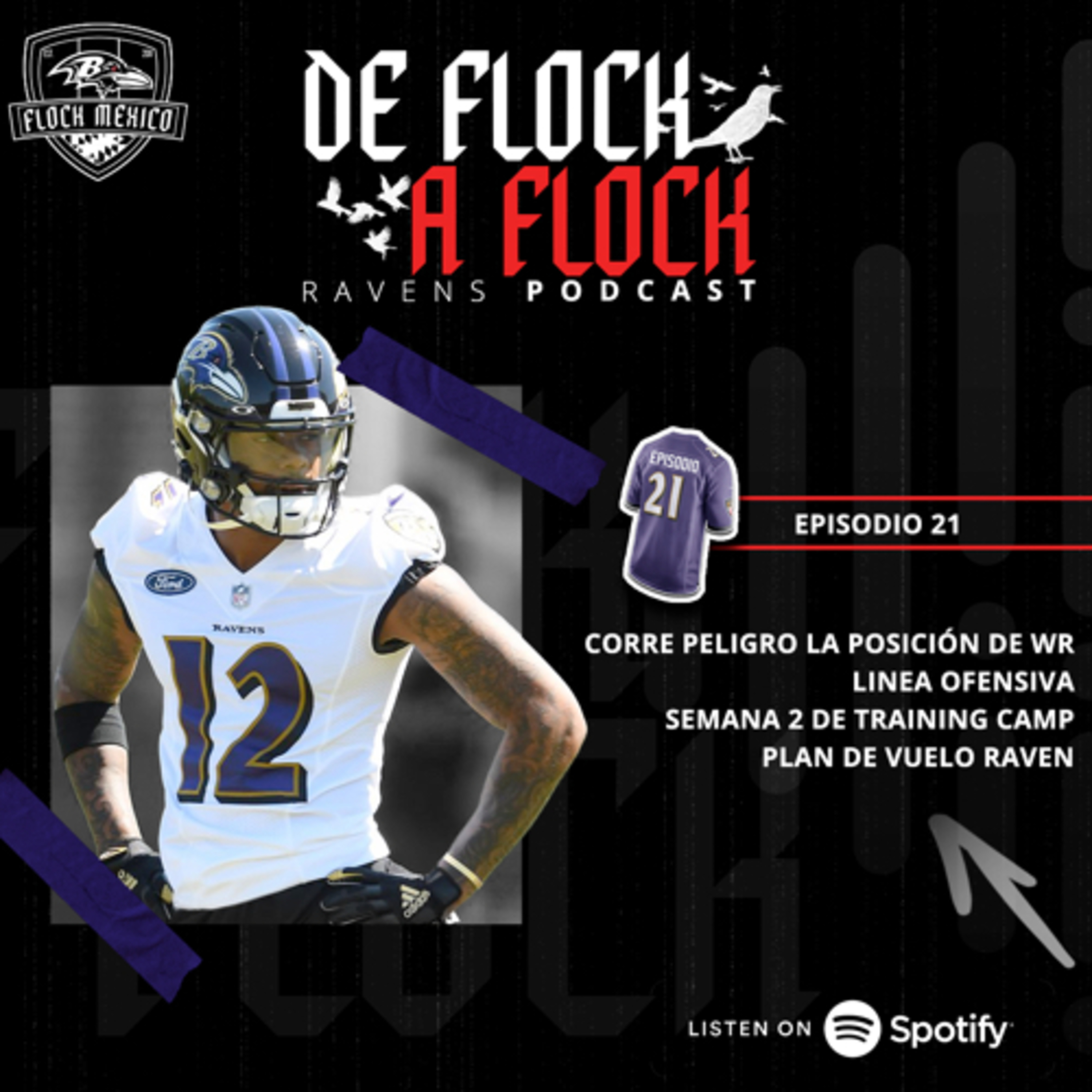Ravens Flock, estamos de regreso una semana más en su FlockCast favorito y en esta semana. Los Ravens tienen problemas en la posición de WR, hay varias bajas por lesiones que al parecer no se consideran de seriedad, pero… corre peligro la posición de WR? Analizamos la línea ofensiva, y veremos lo más relevante de la segunda semana de training camp de los Baltimore Ravens y por supuesto, su sección favorita plan de vuelo raven… y como bonus: una mini previa del juego de pretemporada de este sábado... todo esto en un solo lugar, claro, en su FlockCast favorito de los Ravens…