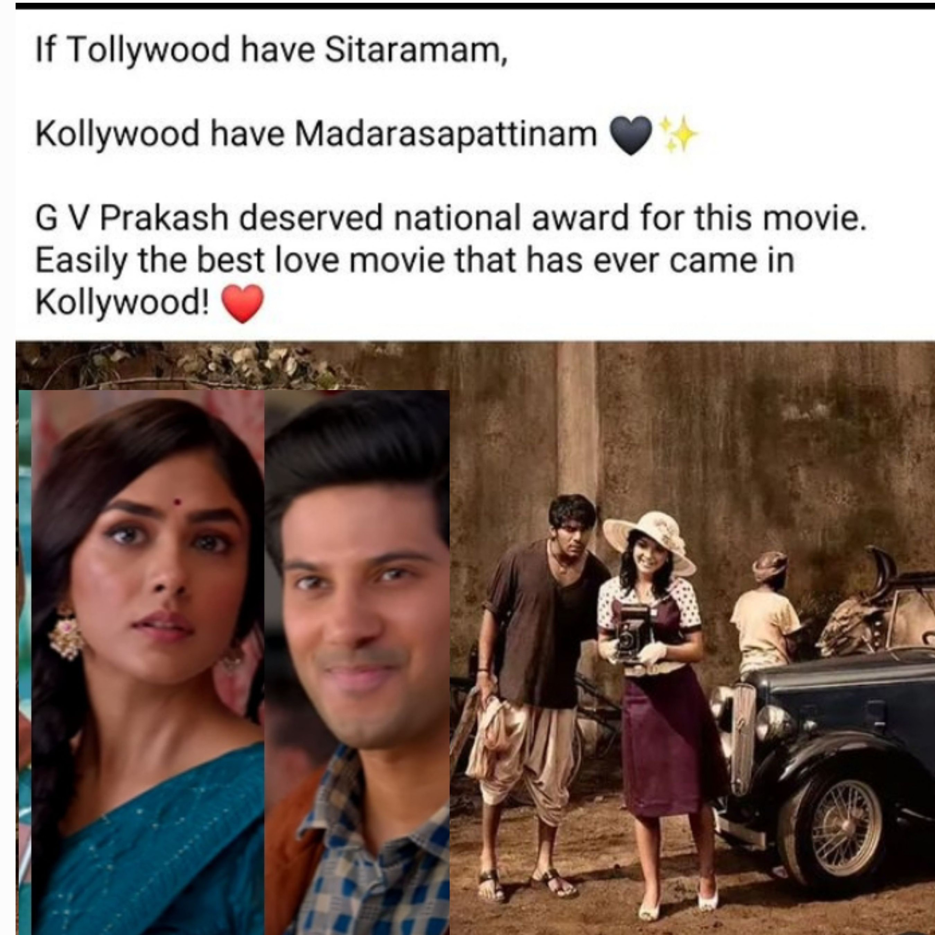 Sita Ramam 😍 Madarasapattinam Tollywood vs. Kollywood .Arya 😉Dulquer Salman .2011 watched Madarasapattinam and felt low and started to think about the struggle of real love and how our ancestors fought for freedom. The love chemistry between Arya and Emy was outstanding .( There is no single kiss scene or a romantic conversation between Arya and Emy ) Still, there is a lot of love between them .Apdiyae cut panna Sitaramam same way dq and mrunal love for each other is outstanding ..cried a lot at the end .This podcast is my personal favorite, Thank you, Directors, for this awesome movie 🎬