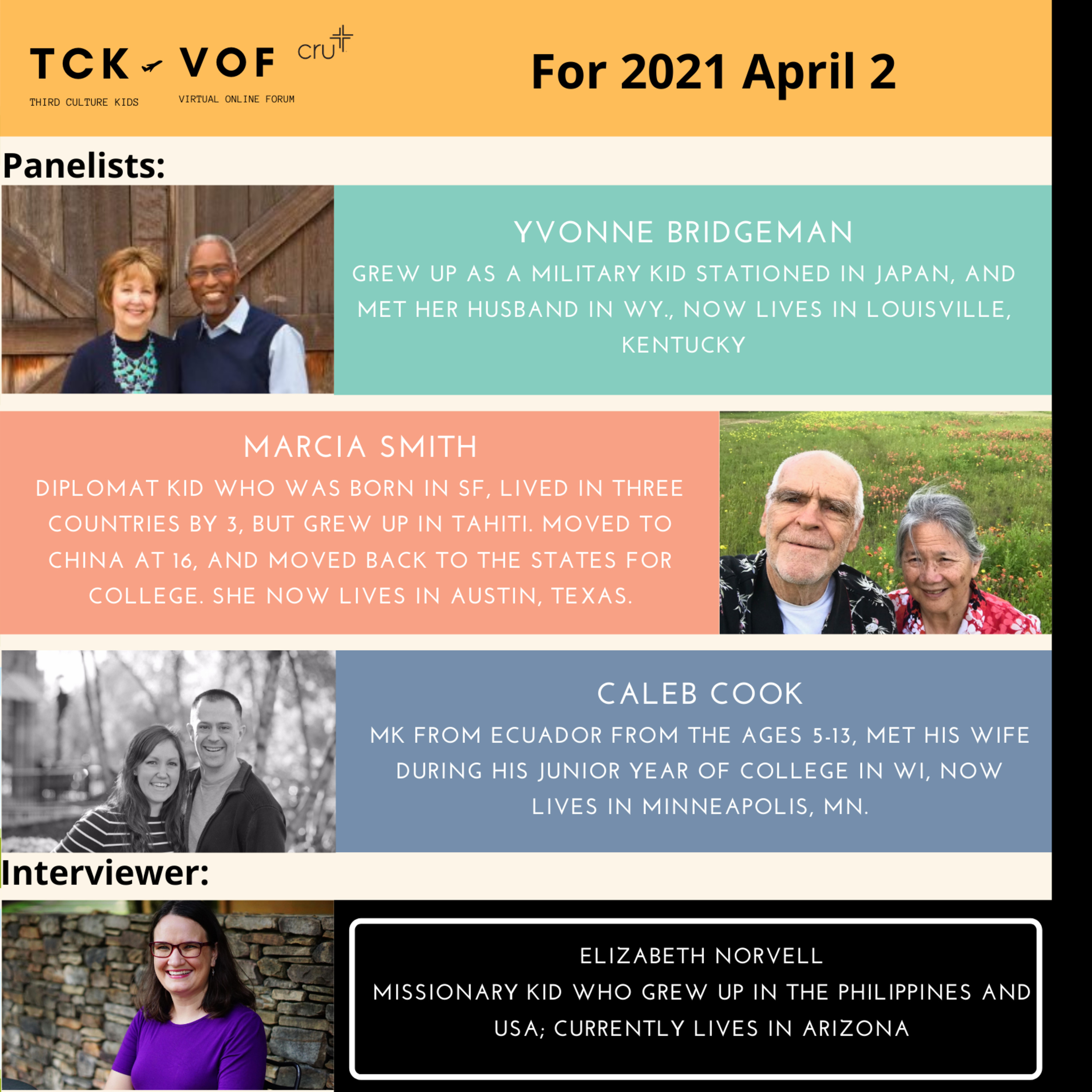 Panelists: Caleb Cook, Marcia Smith, and Yvonne Bridgeman with Elizabeth Norvell as your interviewer.