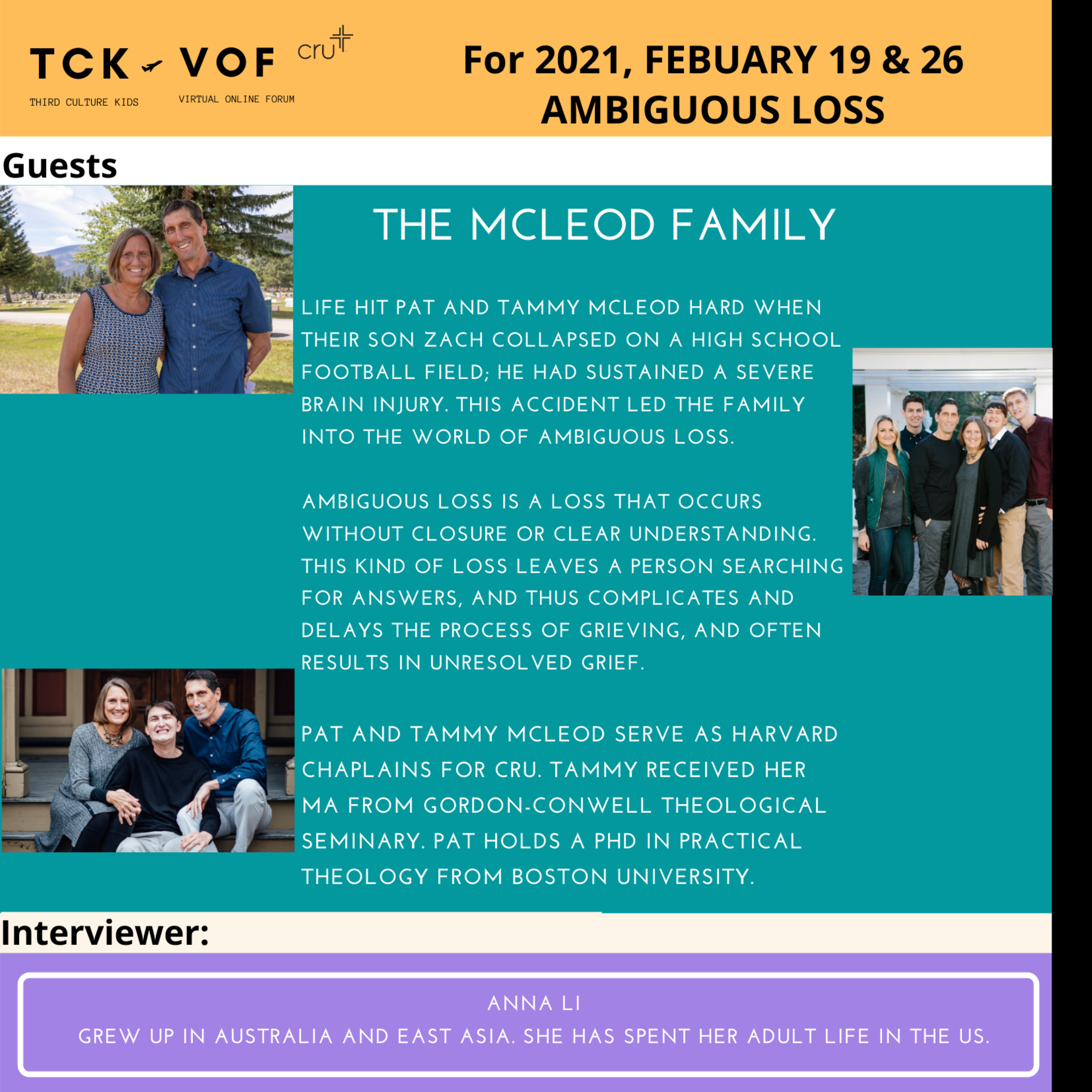 Life hit Pat and Tammy McLeod hard when their son Zach collapsed on a high school football field; he had sustained a severe brain injury. This accident led the family into the world of ambiguous loss. Ambiguous loss is a loss that occurs without closure or clear understanding. This kind of loss leaves a person searching for answers, and thus complicates and delays the process of grieving, and often results in unresolved grief.