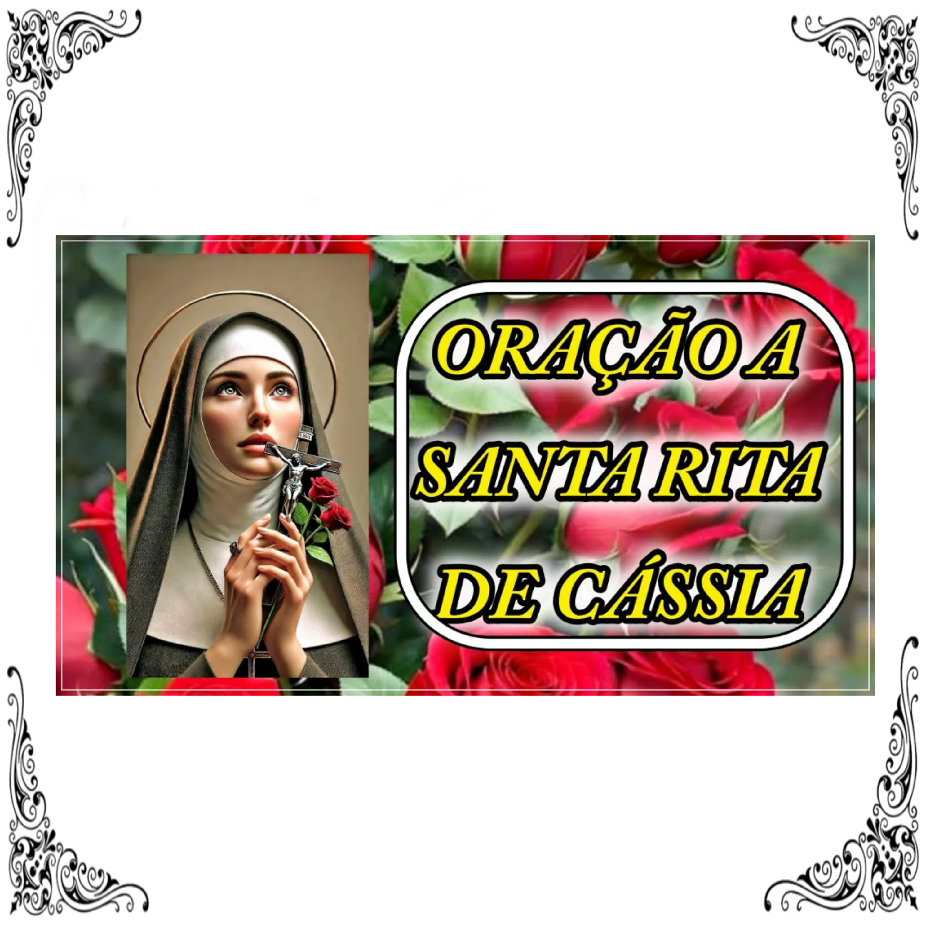 Oração a Santa Rita de Cássia."Ó Poderosa e gloriosa Santa Rita, eis a vossos pés uma alma desamparada que necessitando de auxílio, a vós recorre com a doce esperança de ser atendida por vós que tem o título de Santa dos Casos Impossíveis e Desesperados. Ó cara santa, interessai-vos pela minha causa, intercedei junto a Deus para que me conceda a graça que tanto necessito (faça o pedido). Não permitais que tenha de me afastar de vossos pés sem ser atendido. Se houver em mim algum obstáculo que me impeça de alcançar a graça que imploro, auxiliai-me para que o afaste. Envolvei o meu pedido em vossos preciosos méritos e apresentai-o a vosso celeste esposo, Jesus, em união com a vossa prece. Ó Santa Rita, eu ponho em vós toda a minha confiança. Por vosso intermédio, espero tranquilamente a graça que vos peço.Santa Rita, Advogada dos Casos Impossíveis, rogai por nós."
