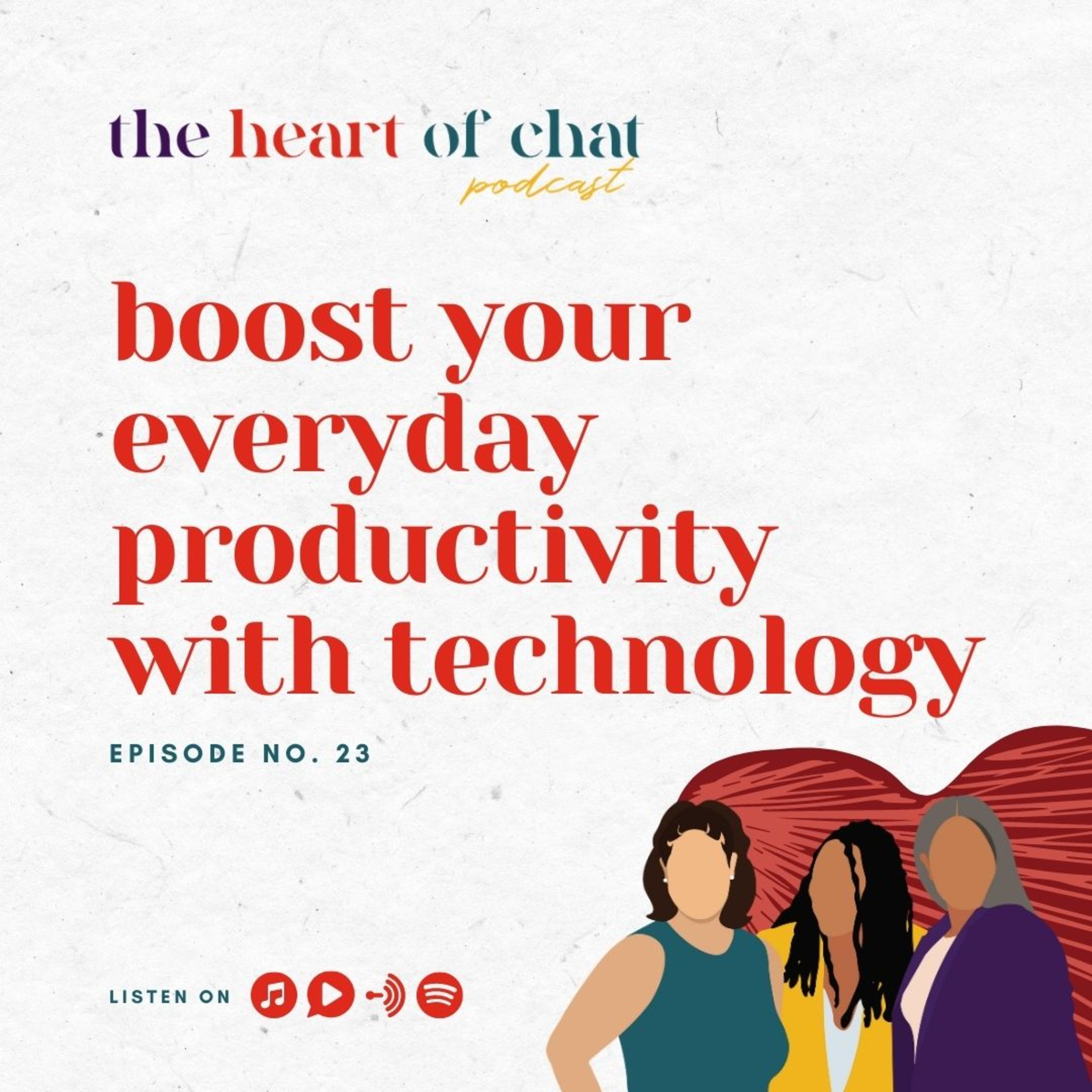 Episode 23 this week is Boost Your Everyday Productivity With Technology with our Hey Maddie series! Maddie is back with some great tips, which will surely boost your productivity, and help you strategize when navigating all things technology. In this episode, we talk about everything from Appleās new iOS (operating system for mobile devices) to gaming systems such as the new PlayStation 5, Xbox, and the game, Among Us. All things tech have us very excited and in deep discussion on this episode. Time saving tips such as using the Google Suite to backup and host photos and videos has been a lifesaver for The Heart of Chat. We hope you find these tips helpful and have a little fun while working to get organized. Tune in for our take and technology.