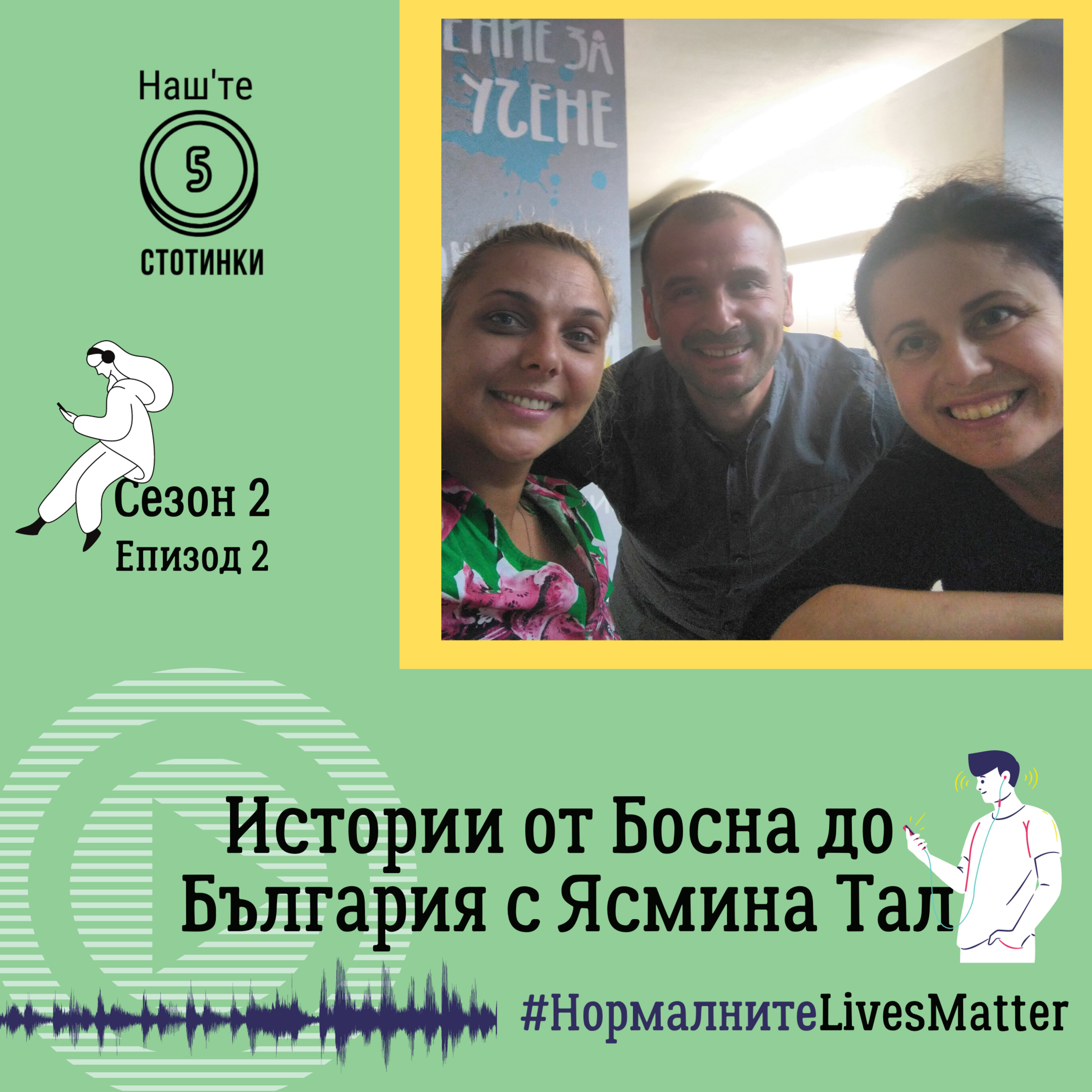 В този втори епизод на подкаста за сезона имаме един специален гост - Ясмина Тал. Тя има български корени, но е родом от едно малко градче в бивша Югославия, билзо до Тузла. Ще чуете много и интересни истории сред които и как се влиза в България с паспорт на държава, която вече е само в учебниците по история, както и как този паспорт е преиздаден и валиден, за да може тя да завърши висшето си образование; какво е представлявала България за хората от бивша Югославия през 90те и ще стане дума и за една жена със синя пухена грейка, синя лента за коса и две флагчета в ръце.