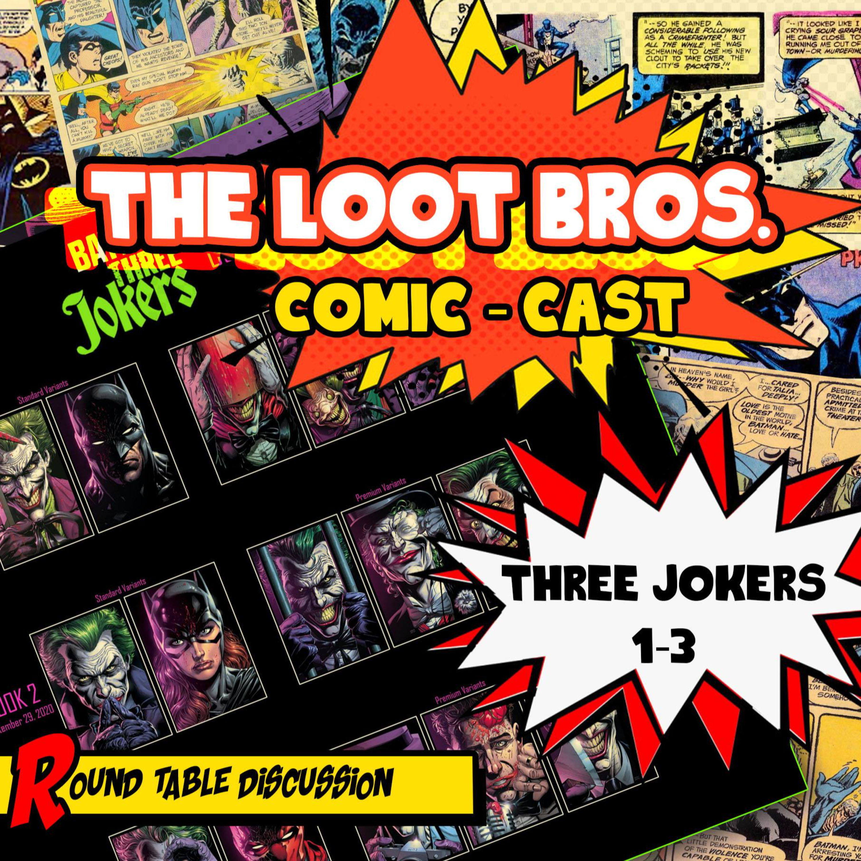 This week Josh and Darrell are joined by Mark (from a Nerd Named Mark Podcast) and Justin (from Geek Life HQ and Epic Tales from the Sewers Podcast) to discuss the entire three issue arc of Batman Three Jokers. The guys have a blast talking books and not only cover Three Jokers, but also answer community questions and pitch their fan theories over where this story could potentially go.