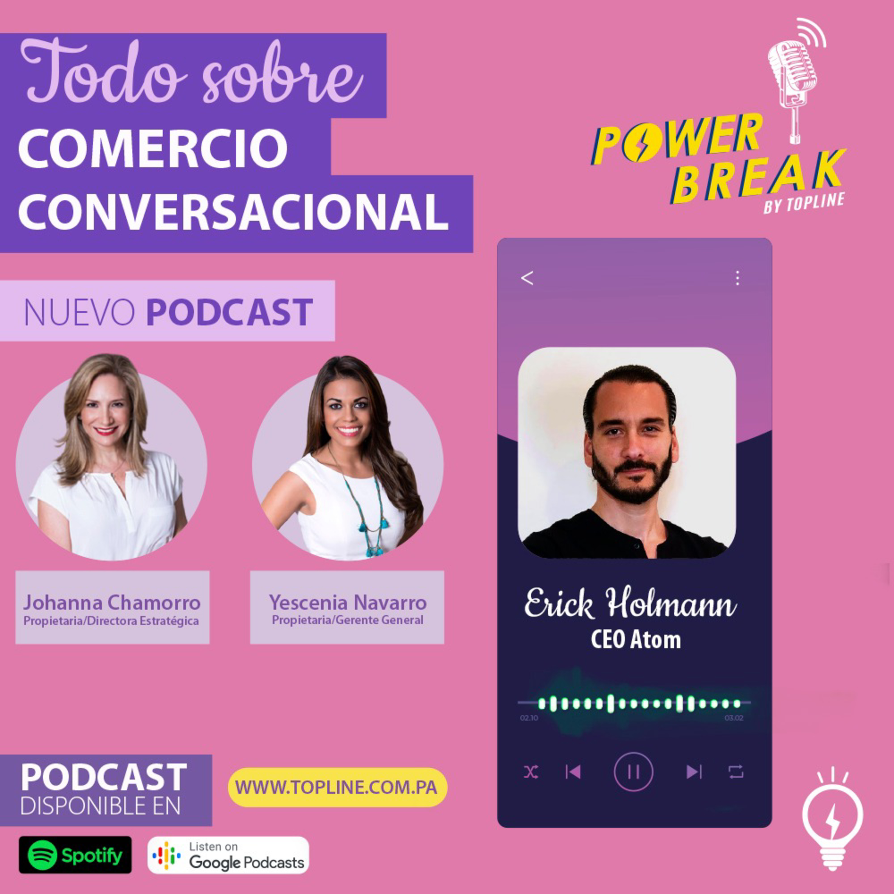Erick Holmann, CEO de Atom, conversó con Topline en uno de nuestros podcasts más interesantes. Atom es un startup panameño recientemente elegido para formar parte del Techstars Boulders´ 2021 Class, uno de los aceleradores de empresas mas importante del mundo. Su propuesta de valor es sencilla (como lo suelen ser las más poderosas): automatizar y simplificar todos los canales de mensajería de una empresa para alcanzar un servicio excepcional y un incremento de 3x en Ventas. Este episodio lo dedicamos a uno de los temas más importantes del mercadeo moderno: la conversión a través de la conversación.