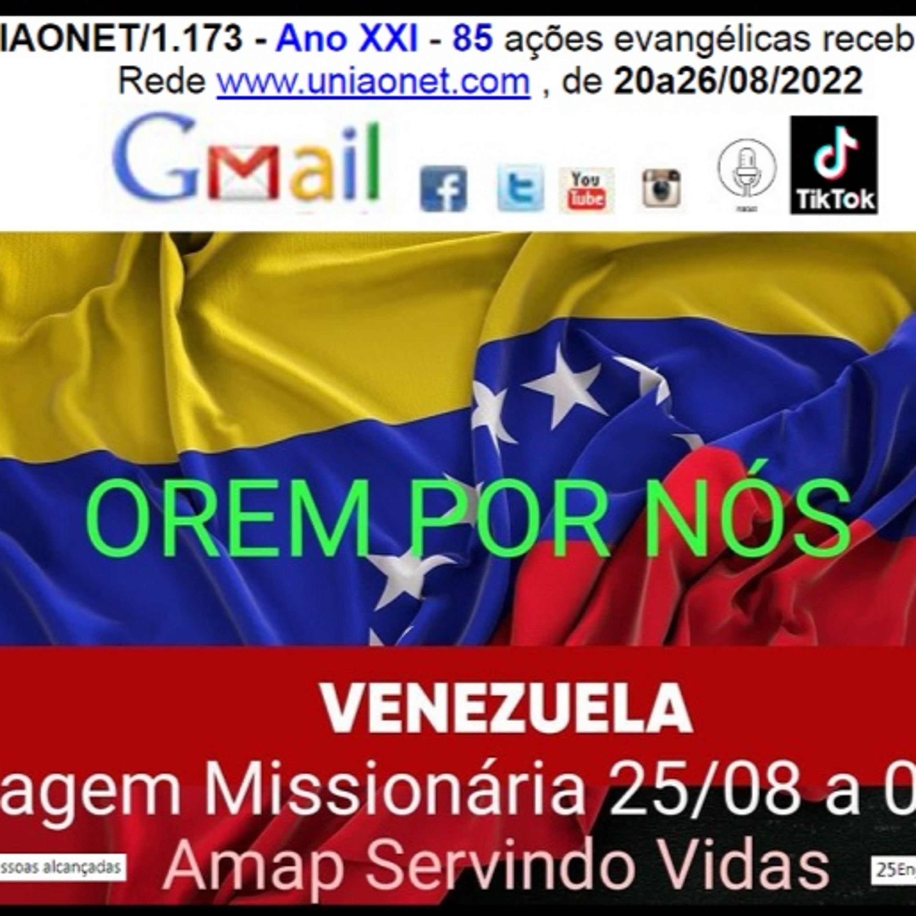 UNIAONET/1.173 - Ano XXI - 85 ações evangélicas recebidas na Rede #uniaonet , de 20a26/08/2022