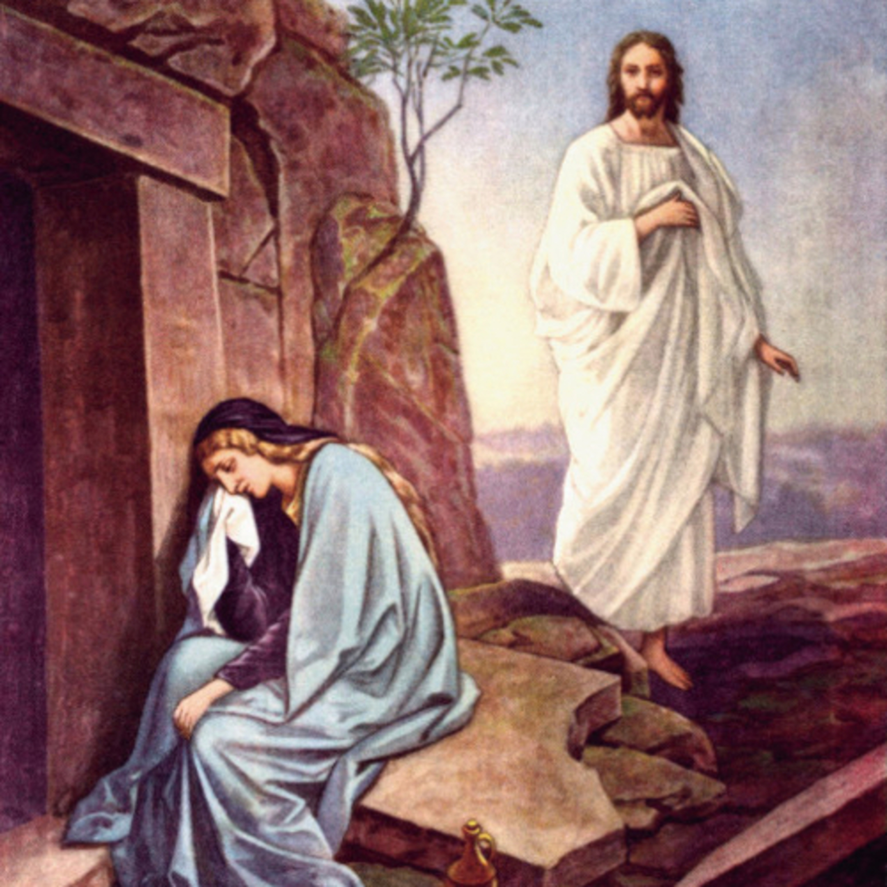 María se había quedado afuera, llorando junto al sepulcro. Mientras lloraba, se asomó al sepulcro