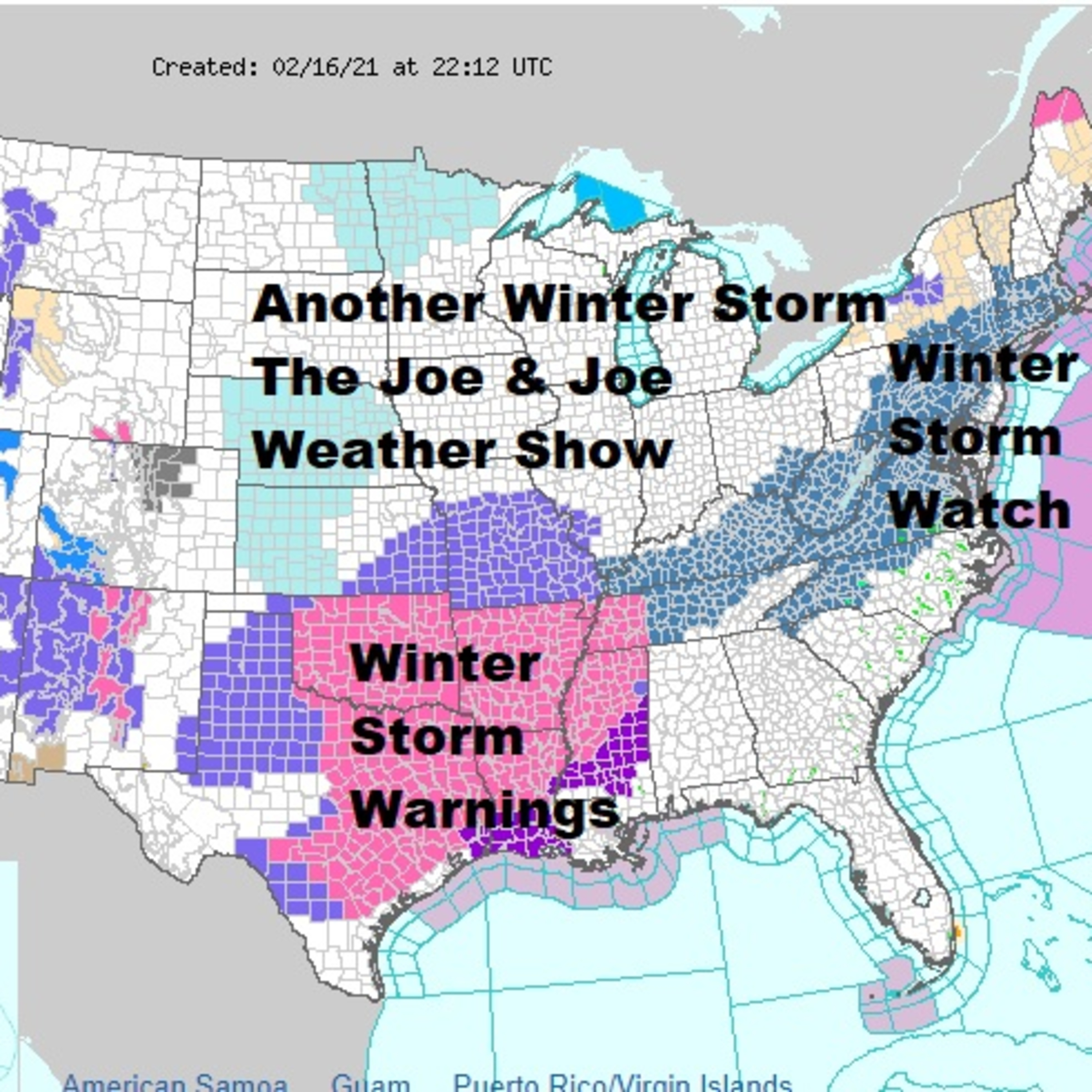 Joe & Joe Weather Show Tuesday February 16, 2021 There is no rest for the weary with another winter storm developing. Winter Storm Warnings across the south from Texas to the lower Mississippi Valley. Winter Storm Warches Tennessee to the Carolinas and northeast to New England for Wednesday night and Thursday. Bitter cold continues across the south with some moderation coming over the next few days.