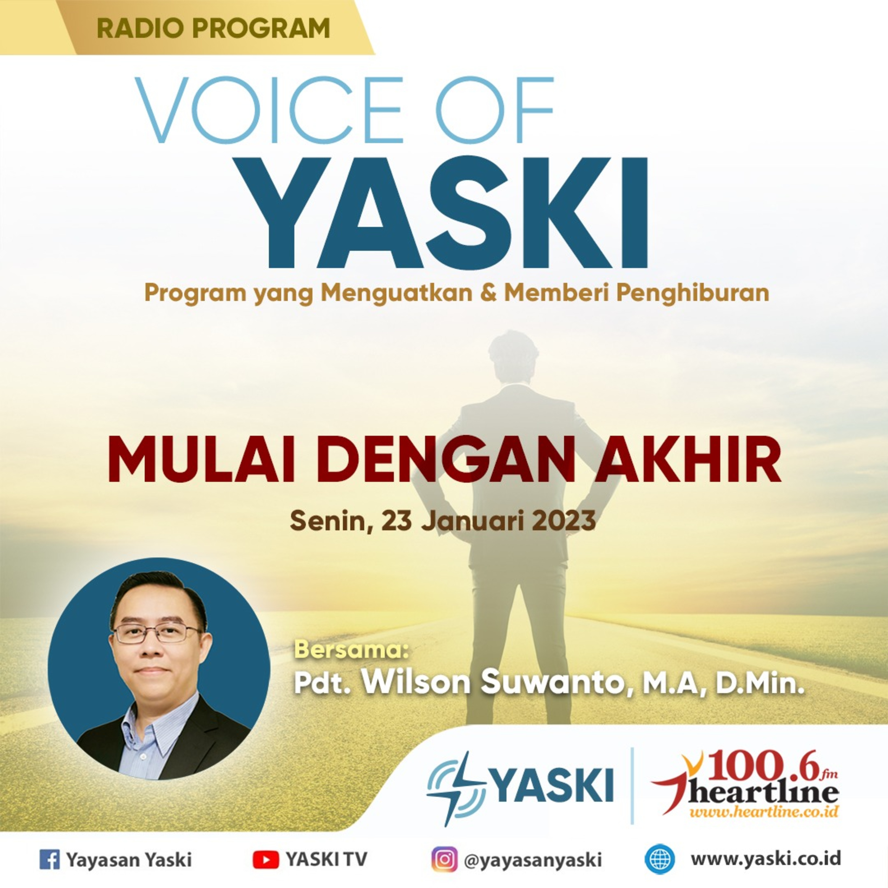 Salam sejahtera buat Anda dan keluarga dimanapun berada. Kembali Anda menyimak program VOICE OF YASKI, sebuah renungan untuk Anda memulai hari dan pekan yang baru bersama Tuhan Yesus Kristus. Kali ini renungan berjudul Kristus adalah Memulai Dengan Akhir.