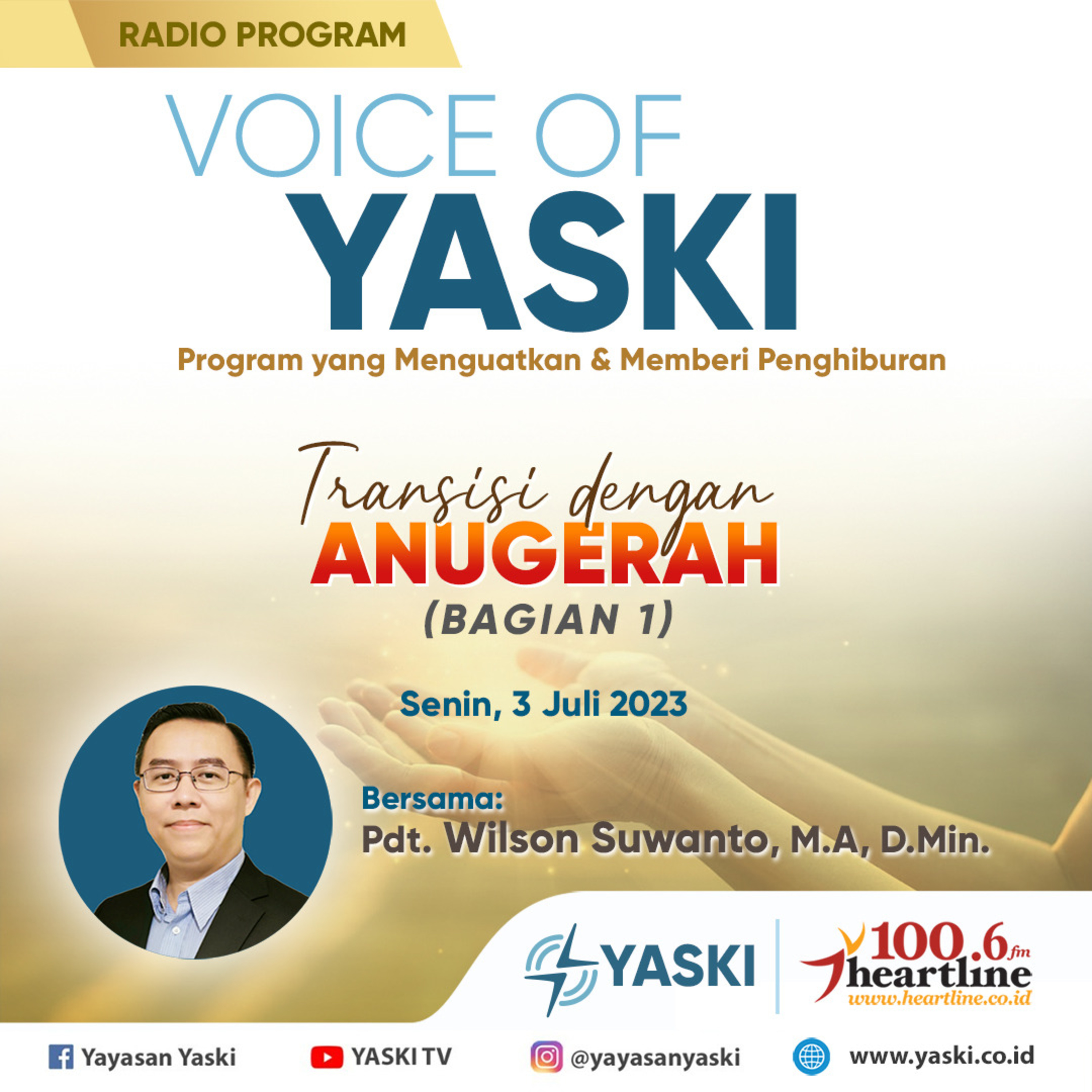 Salam sejahtera buat Anda dan keluarga dimanapun berada. Kembali Anda menyimak program VOICE OF YASKI, sebuah renungan untuk Anda memulai hari dan pekan yang baru bersama Tuhan Yesus Kristus. Kali ini renungan berjudul Transisi dengan Anugerah bagian 1.