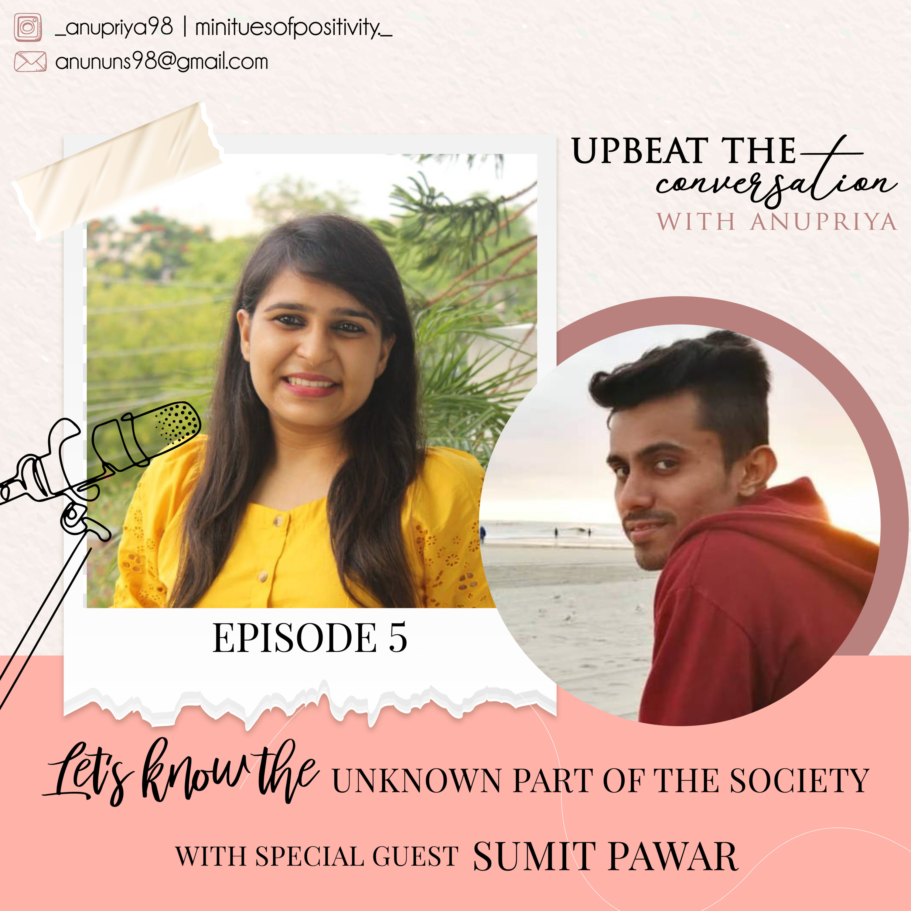 Hello guys, Welcome to my podcast Upbeat the conversation with Anupriya. This time I took an interview with Sumit Pawar on the topic LGBTQ+IA community, To know the Unknown part of the Society. We all are almost unaware of this topic, we have talked about the issues, problems, facts, etc. To know more about this, listen to my podcast. All of your Suggestions, Feedbacks, Questions are welcome. If you wish to reach out to this community or seeking any kind of help please contact Sumit. You can follow the page The Qknit on Facebook, Instagram, or you can connect with Sumit on Instagram- sumitpawar3158 or you can drop a mail to him sumitpawar201991@gmail.com. You can reach out to me also on Instagram - _anununs98 / minutesofpositivity._ or you can drop a mail anununs98@gmail.com.