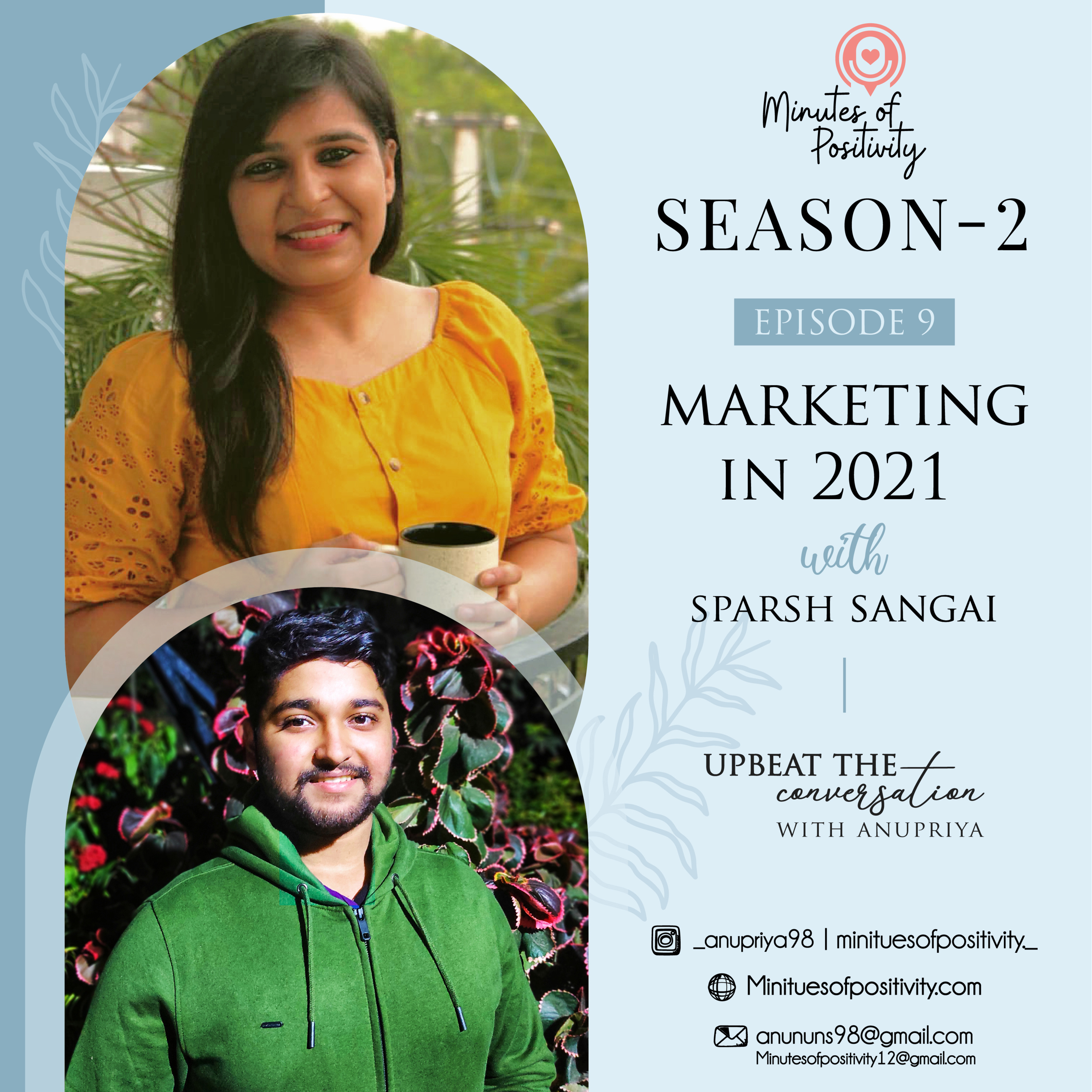 Hello Guys, Welcome to my Podcast Upbeat the Conversation with Anupriya. Today I have my batchmate with me to talk about marketing. He has his hands on marketing for the past 2 years and has a great knowledge of the same. To know more about the episode go listen to it. All of your Suggestions, Feedbacks, Questions are Welcome. You can connect with me on Instagram - minutesofpositivity._ / _anupriya98 or you can drop a mail at - minutesofpositivity12@gmail.com / anununs98@gmail.com You can directly reach out to Sparsh on Instagram - sparsh_sangai
