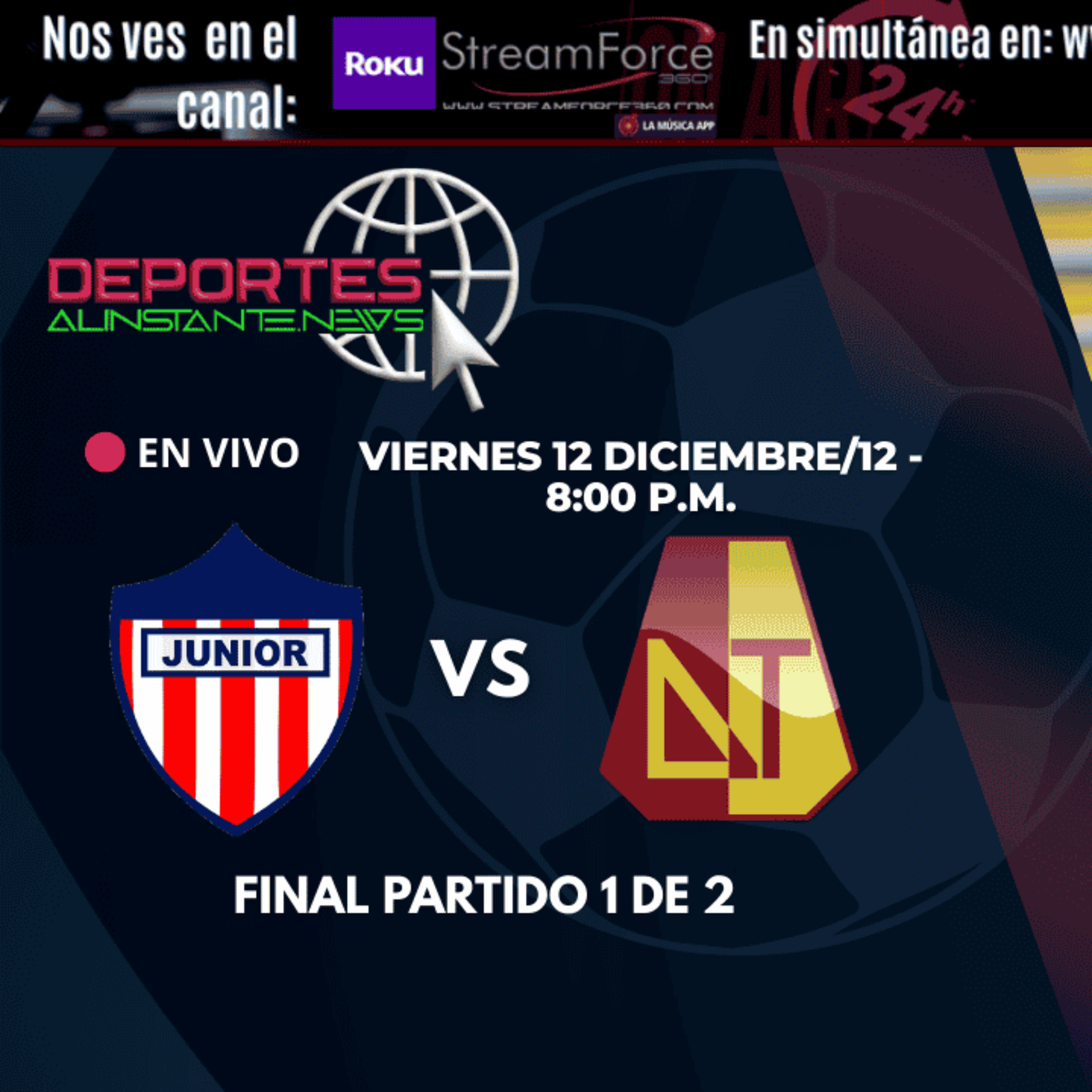 📅 Fecha y hora: Hoy – 2025-12-12T20:00:00-05:00 (8:00 p.m. hora Colombia) Diario AS🏟️ Lugar: Estadio Metropolitano Roberto Meléndez, Barranquilla Diario AS🏆 Competencia: 1a Ronda Final – Liga BetPlay II-2025 (Final de ida) Diario AS🎯 Previa informativa:Se enciende la gran final de la Liga BetPlay II-2025. Junior, con el apoyo de su afición en el Metropolitano, quiere tomar ventaja en el primer capítulo de esta serie, mientras que Tolima, invicto y sólido durante la fase de cuadrangulares, busca un resultado que lo ponga en posición de definir el título en casa. Expectativas de intensidad táctica, duelos cerrados y emoción hasta el último minuto. Diario AS🎙️ Producción original:Esta cobertura y análisis deportivo es producida por DeportesAlInstanteNews, dentro del ecosistema de medios StreamForce360.com, junto con EsferaDigital.News y FarandulaEnVivo.com.Todo el material (gráficas, narración, clips propios y música libre de derechos) es original y seguro.🧩 Aviso de cumplimiento legal:No se retransmite señal oficial de TV ni streaming.El contenido es análisis, opinión y cobertura informativa original.Marca sombrilla: StreamForce360.comContacto oficial: proyectos@streamforce360.com👉 Suscríbete y activa 🔔 para seguir nuestras coberturas, resúmenes y análisis exclusivos.🌐 Plataforma principal: https://DeportesAlInstante.News🎥 Ecosistema oficial: StreamForce360.com📌 Cobertura periodística y análisis deportivo del partido Junior vs Tolima (ida de la final).No se retransmite señal oficial ni material de terceros.🎙️ Producción original: DeportesAlInstanteNews📡 Ecosistema oficial: StreamForce360.com🌐 Más contenido: https://DeportesAlInstante.News