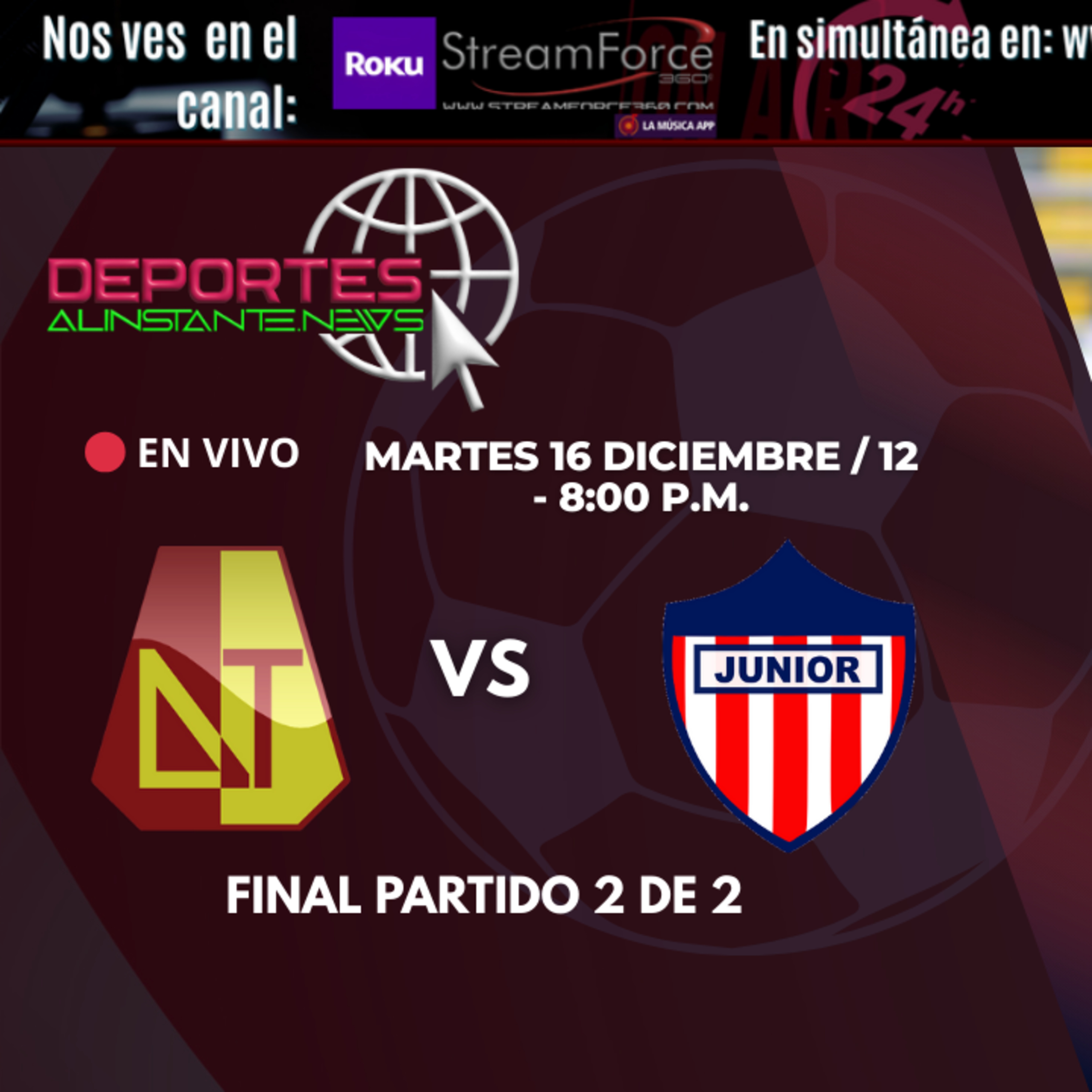 ⚡ Evento: Deportes Tolima vs Junior📅 Fecha y hora: Hoy – Final de vuelta (hora Colombia)🏟️ Lugar: Estadio Manuel Murillo Toro – Ibagué🏆 Competencia: Serie final – fútbol profesional colombiano (partido de vuelta)🎯 Previa informativaSe define el campeón. Tolima y Junior se enfrentan en el partido decisivo de la gran final, con una serie abierta que promete intensidad, ajustes tácticos y máxima presión. Análisis del contexto, claves estratégicas, jugadores determinantes y escenarios posibles en una noche que marcará la temporada.🎙️ Producción originalEsta cobertura periodística y análisis deportivo es producida por DeportesAlInstanteNews, dentro del ecosistema de medios StreamForce360.com, junto con EsferaDigital.News y FarandulaEnVivo.com.Todo el contenido (gráficas, narración, clips, sonidos y opinión) es 100 % original, propio y libre de derechos.🧩 Aviso de cumplimiento legalNo se retransmite señal de televisión ni streaming oficial.Contenido informativo, análisis y opinión independiente.Marca sombrilla: StreamForce360.comContacto oficial: proyectos@streamforce360.com👉 Suscríbete y activa la campana 🔔 para seguir nuestras finales, análisis y coberturas especiales.🌐 Plataforma principal: https://DeportesAlInstante.News🎥 Ecosistema oficial: StreamForce360.com