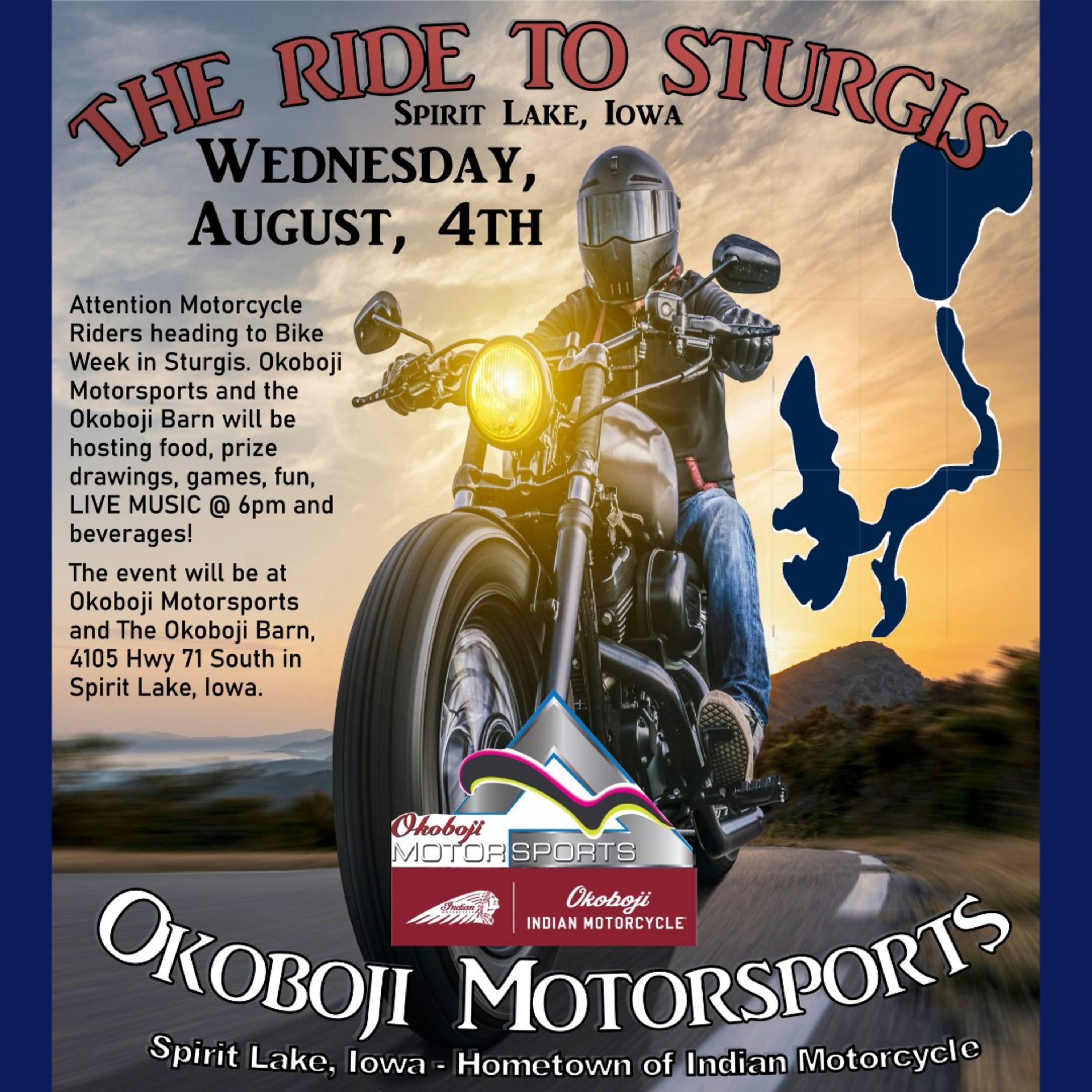 One up your Sturgis experience with the "RIDE TO STURGIS" event sponsored by Okoboji Motorsports and the Okoboji Barn on August 4th. Tony Petersen, Ashley Weringa of Okoboji Motorsports and Paula Randen of the Okoboji Barn have put together a full day event complete with a Ride around Okoboji, music from Farm Rock and Jack Daniels Bottle Engravers & The Barrel Man, Jack Sanders will be on hand. Get ready to ride!