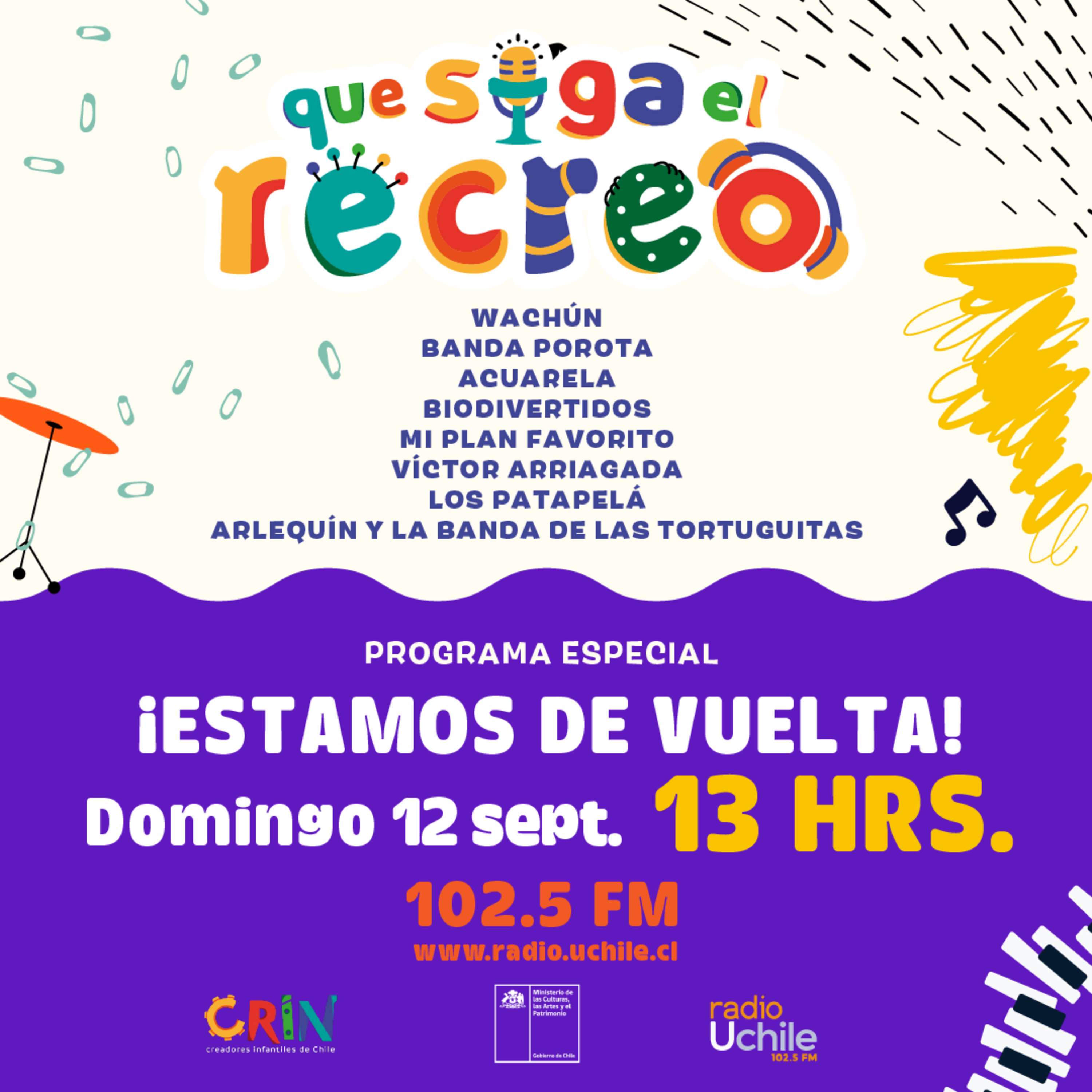 Volvemos con nuestro programa radial "Que siga el recreo" en la Radio Universidad de Chile @radiouchile (102.5FM) 📻, junto a l@s conductores @guspatapela y @frantorrescanta de Epewtufe 💜.