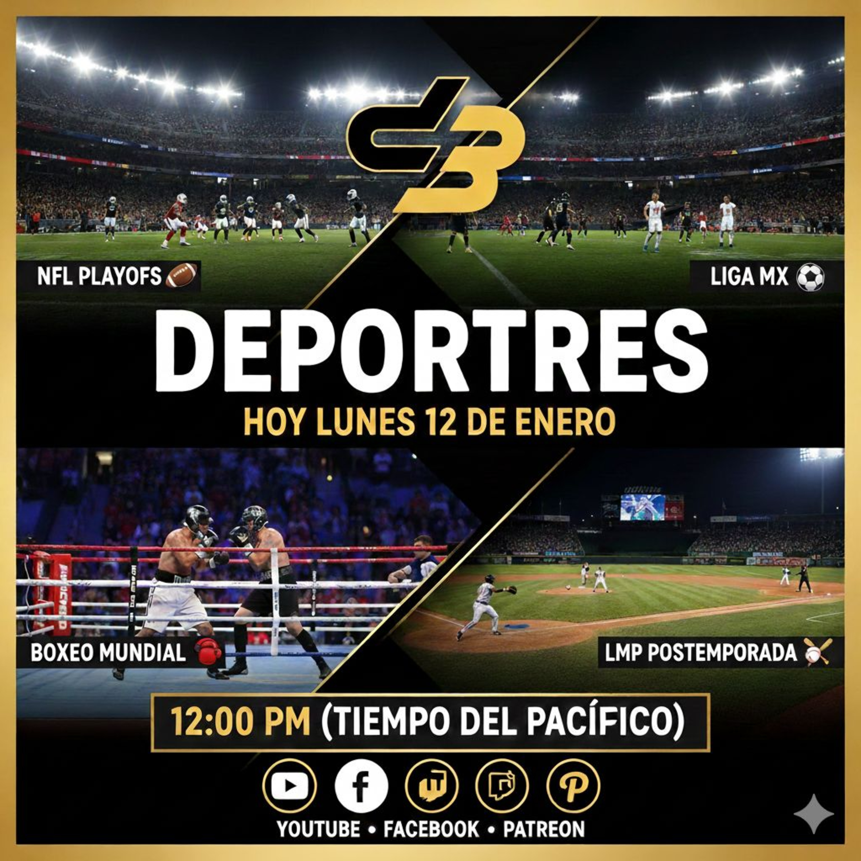 En el Deportres de hoy: Increíble semana de comodines en la NFL, donde todos los partidos estuvieron cerrados y emocionantes, y por desgracia para la aficion Charger, se fueron eliminados en Nueva Inglaterra, en la liga MX, decepcionante empate sin goles entre Tijuana y America, victoria de las Chivas, empate de Pumas y caída de Cruz Azul, ademas de la victoria de Barcelona en el clásico mundial ante Real Madrid y los resultados de las principales ligas del mundo, jornada de knock out en el boxeo mundial, la postemporada de la liga mexicana del pacifico en el beisbol, y lo mejor de la NBA en el baloncesto, y como siempre tu participación.https://www.patreon.com/Deportres