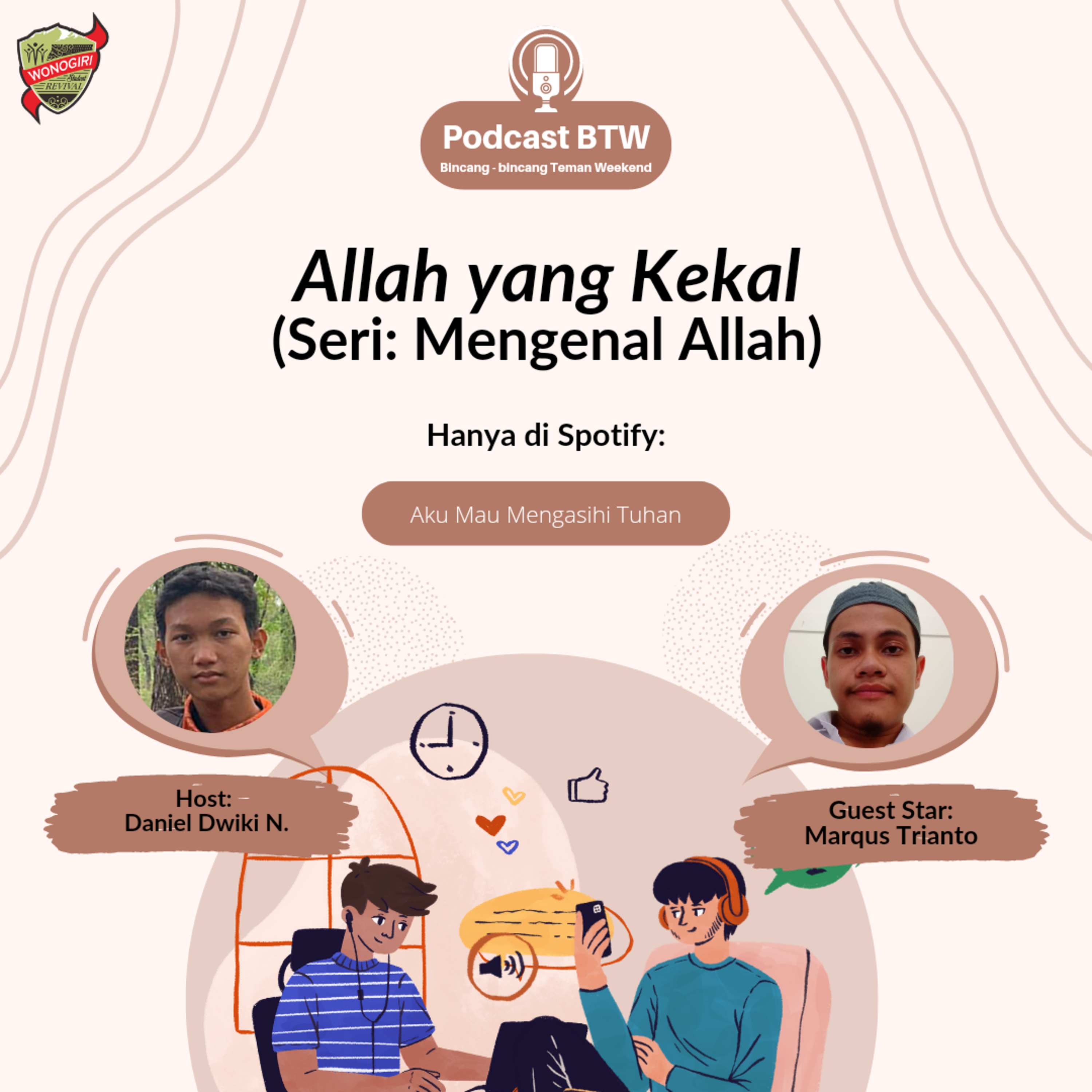 Wonogiri Student Revival (WSR) mengajak sobat muda untuk belajar bersama lewat BTW: Bincang-bincang Teman Weekend. Episode ini merupakan bincang-bincang bersama tamu spesial. Episode kali ini kita akan ngobrol-ngobrol tentang "Allah yang Kekal”. Stay tune terus di sini ya.