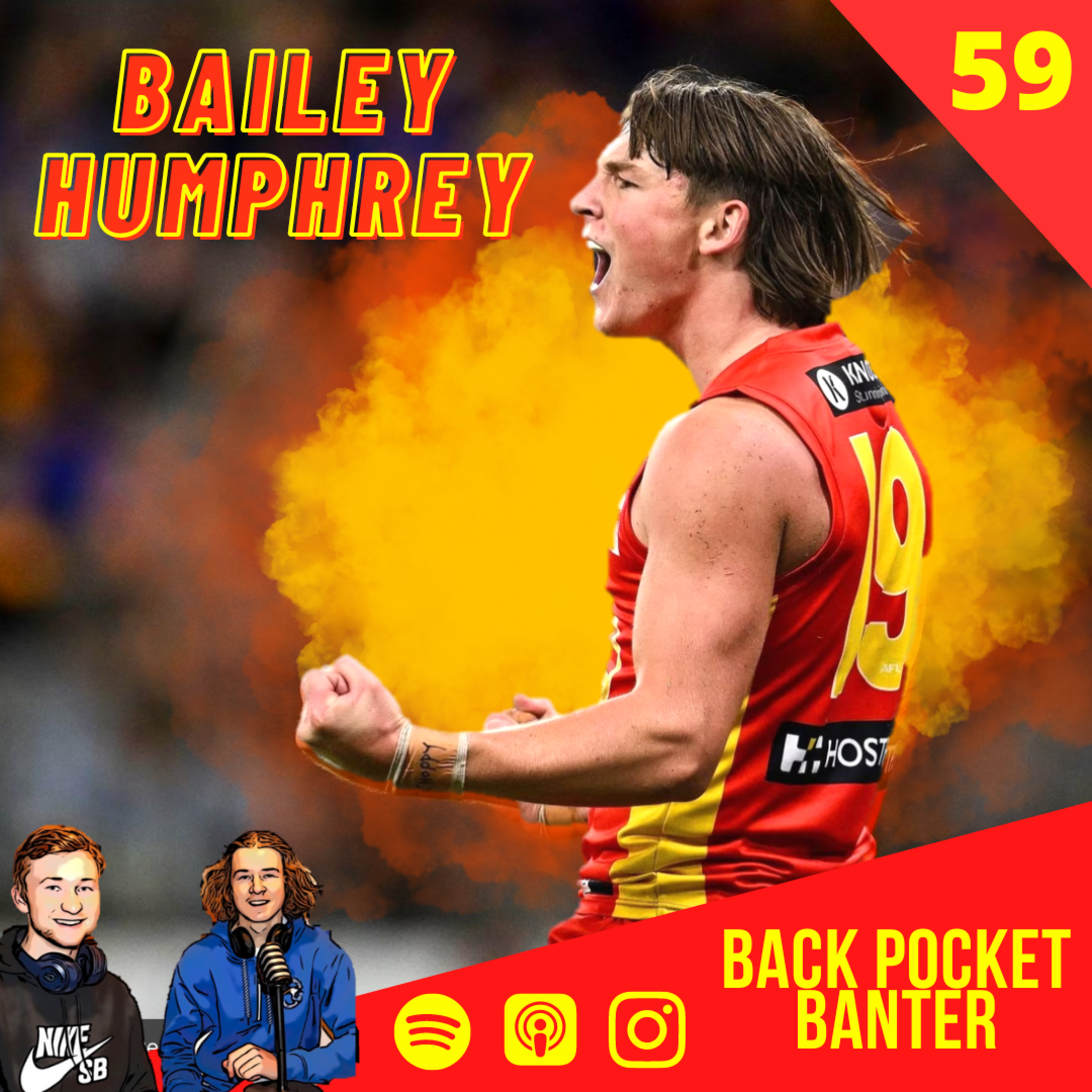 Episode 59 is here and what a treat Connor and Blair have for you listeners, one of the most exciting up and coming players in the AFL, Bailey Humphrey sat down and joined the lads from Gold Coast to chat about his career so far. The boys spoke about being drafted with pick number 6 last year, moving away from home, Rowelly eating grass and also discuss mental health which Bailey is very passionate about. They touch on the dominant start to his career including the rising star nomination that he received two rounds ago and his plans for living in a house with Wil Powell. The 'Under Fire' segment also makes its debut, there is some pressure in lining up on Dusty, but this segment is next level.