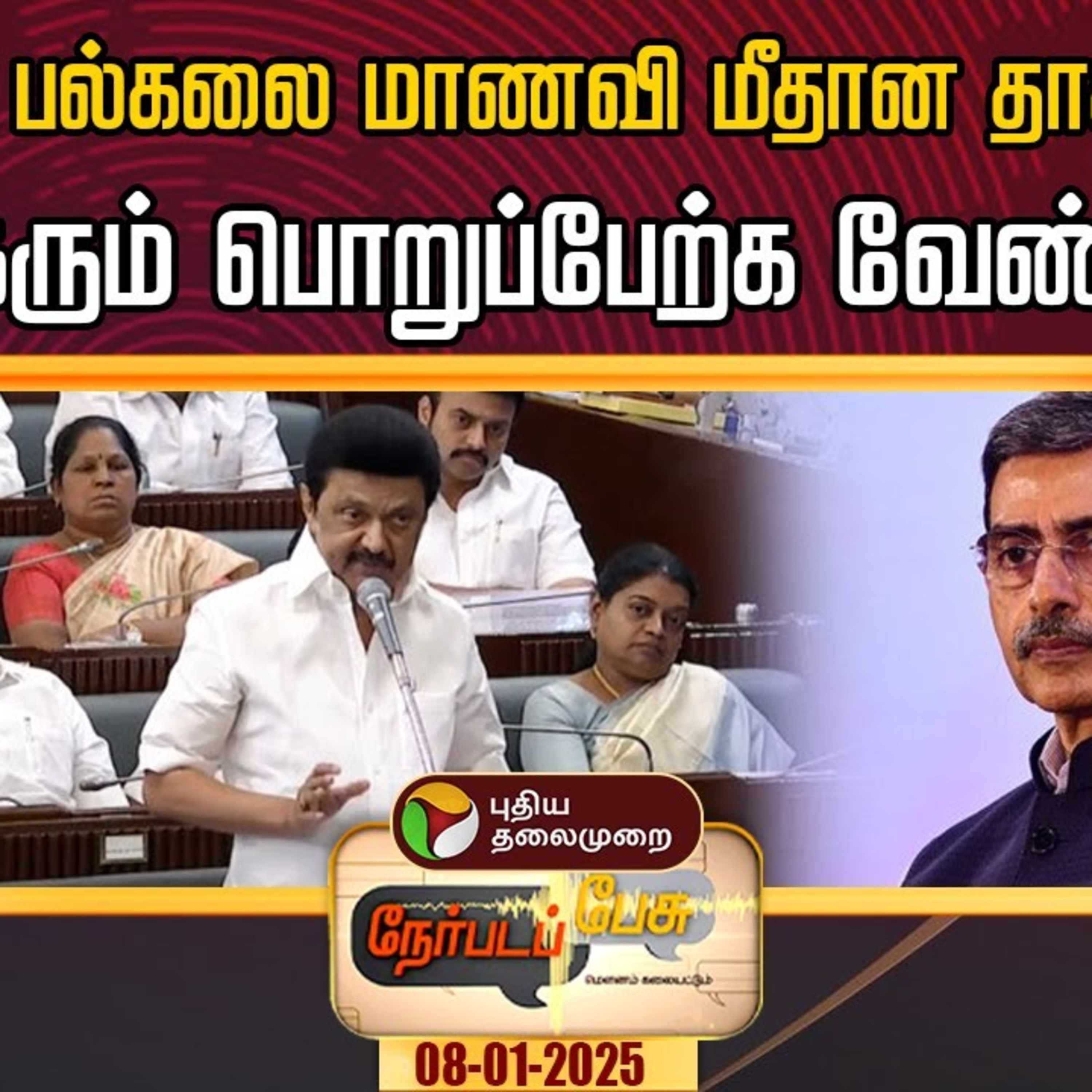 நேர்படப்பேசு : Anna University issue | சட்டமன்றத்தில் உரக்க ஒலித்த குரல்கள்... அண்ணா பல்கலை மாணவி மீதான தாக்குதலுக்கு ஆளுநரும் பொறுப்பேற்க வேண்டுமா?