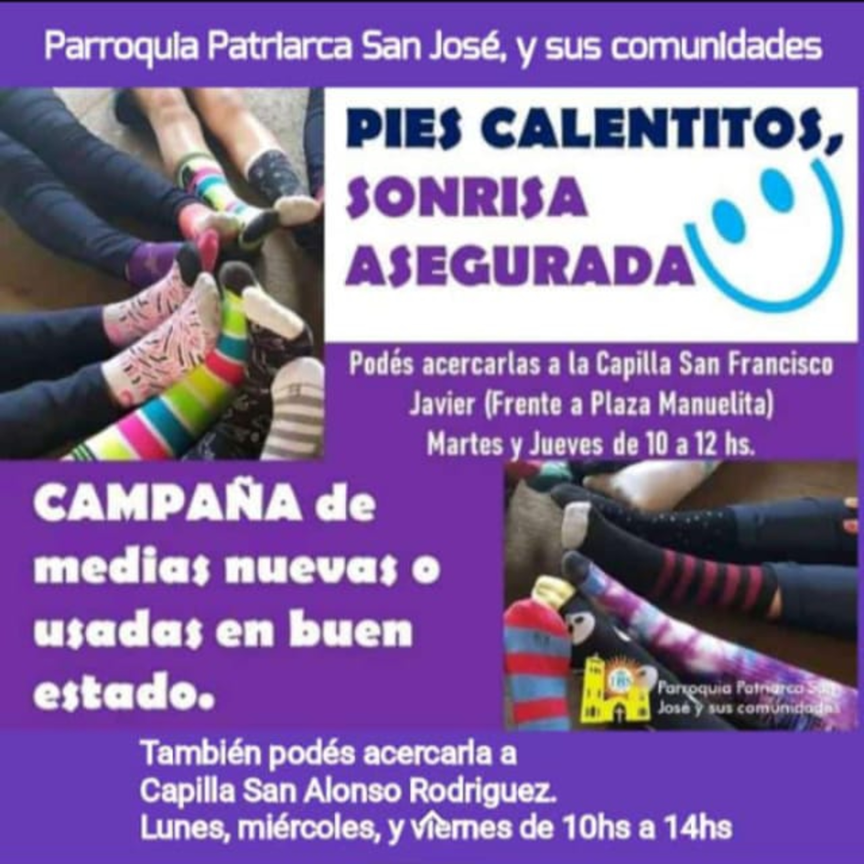 Desde San Miguel, Provincia de Buenos Aires, nos llega la nueva campaña impulsada por la Parroquia Patriarca de San José. La misma consiste en la recolección de medias (nuevas y usadas), mantas y abrigo para la cama y toallas. Toda lo recaudado es entregado a las personas que más lo necesitan, que nuclean a más de 650 familias. ¡Sumate a la campaña de la Parroquia!